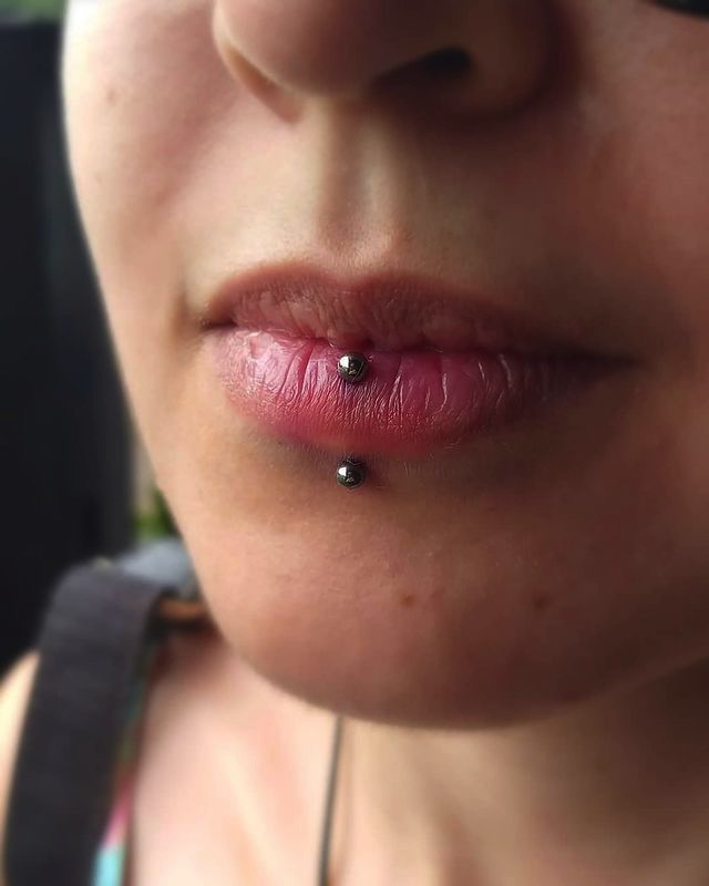 Perfurações Labret e Vertical Labret realizadas pela piercer brasileira Amanda Sargiani.