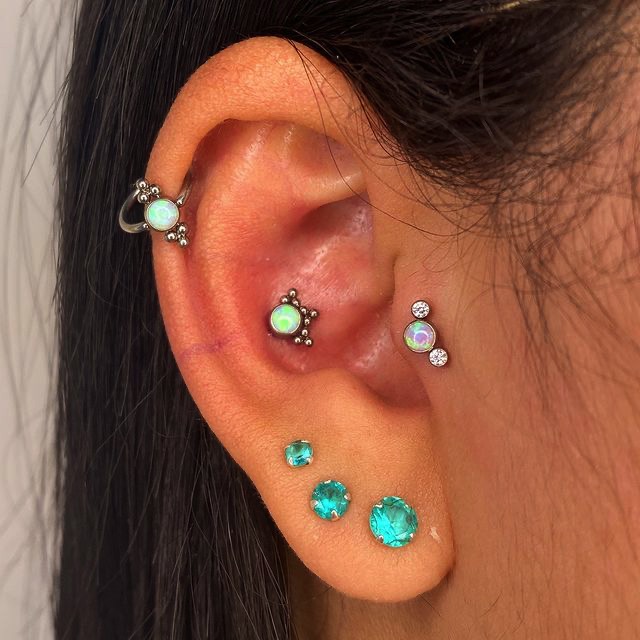 O que você acha de um projeto auricular que inclui jóias de várias cores que combinam? Os piercings coloridos estão se tornando cada vez mais populares, e dá pra entender o porquê, fica lindo demais.