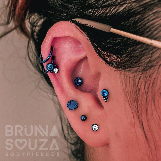 As duas fotos anteriores são de um projeto auricular inspirado no fundo do mar. Ficou lindo né? As perfurações foram no Daith, Conch e Lobe.