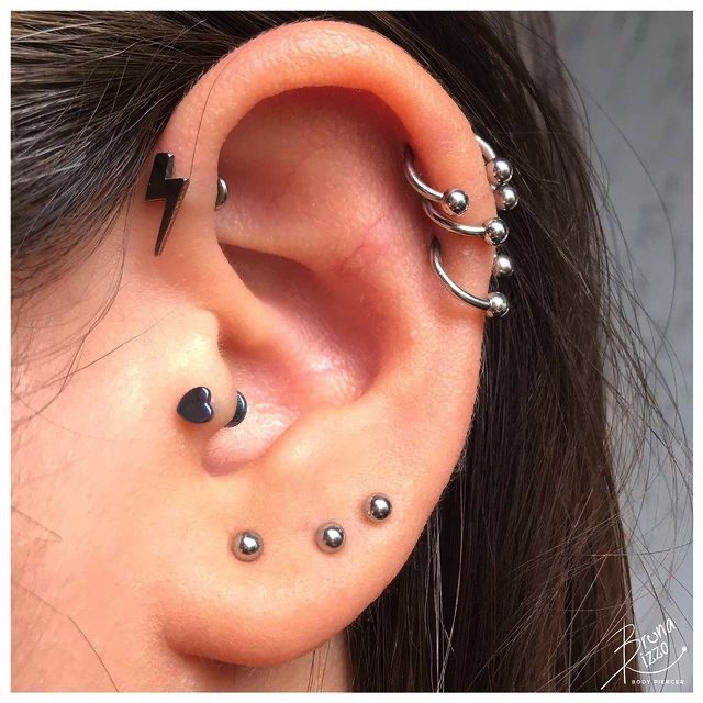 Várias inspirações de piercings na orelha feitos pela piercer brasileira Karina Hermann.