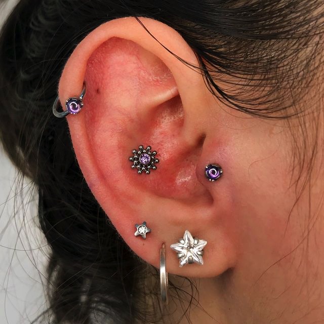 Nas fotos acima temos 3 projetos auriculares incríveis feitos por piercers brasileiras e com jóias que você consegue encontrar aqui no Brasil. Perfurações no Daith, Helix, Targus, Forward Helix, Lobe e Conch.