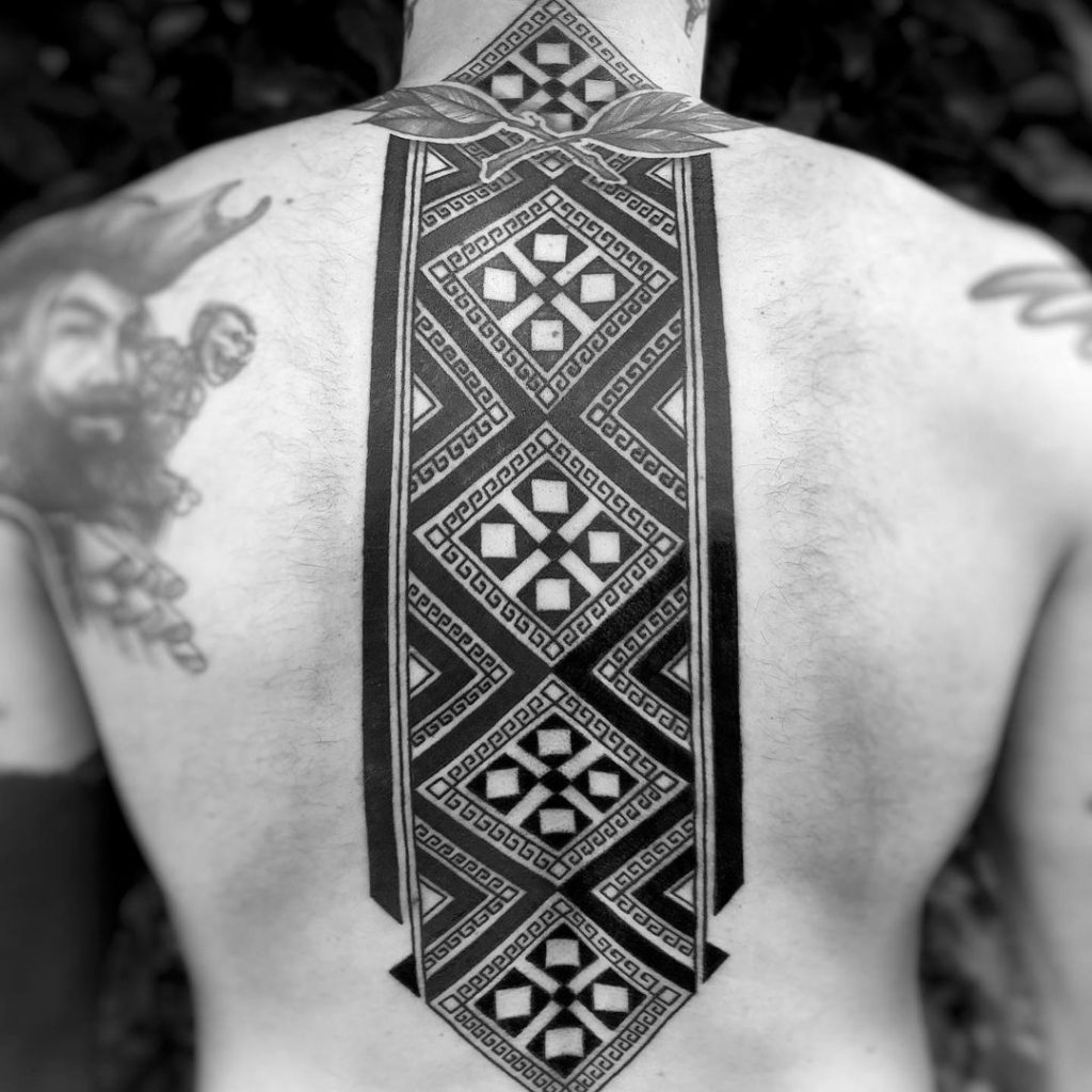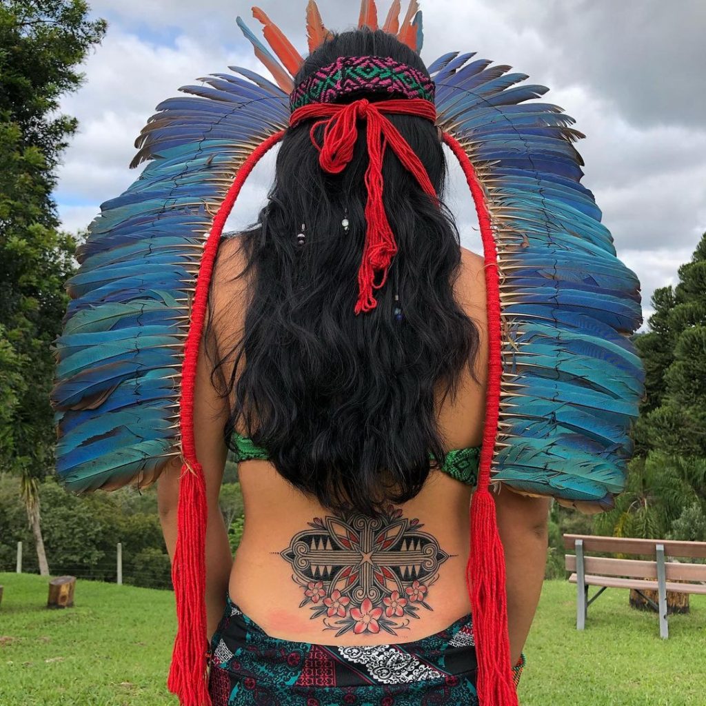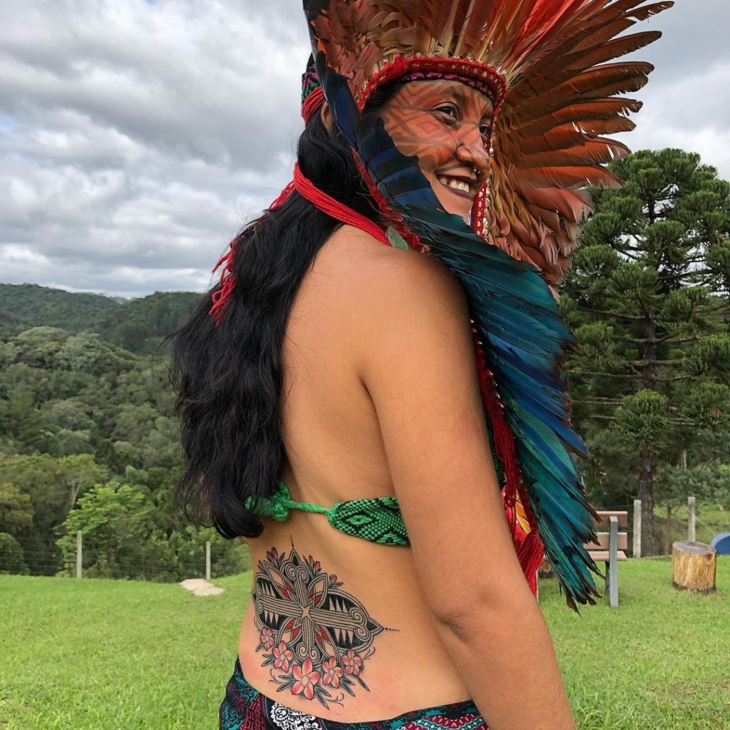 Foi nessa conversa que, dentre outras pautas, ele manifestou que gostaria que eu carregasse os grafismos do seu povo para o mundo. Me sugerindo e autorizando a trazer os grafismos Huni Kui para as minhas tatuagens.