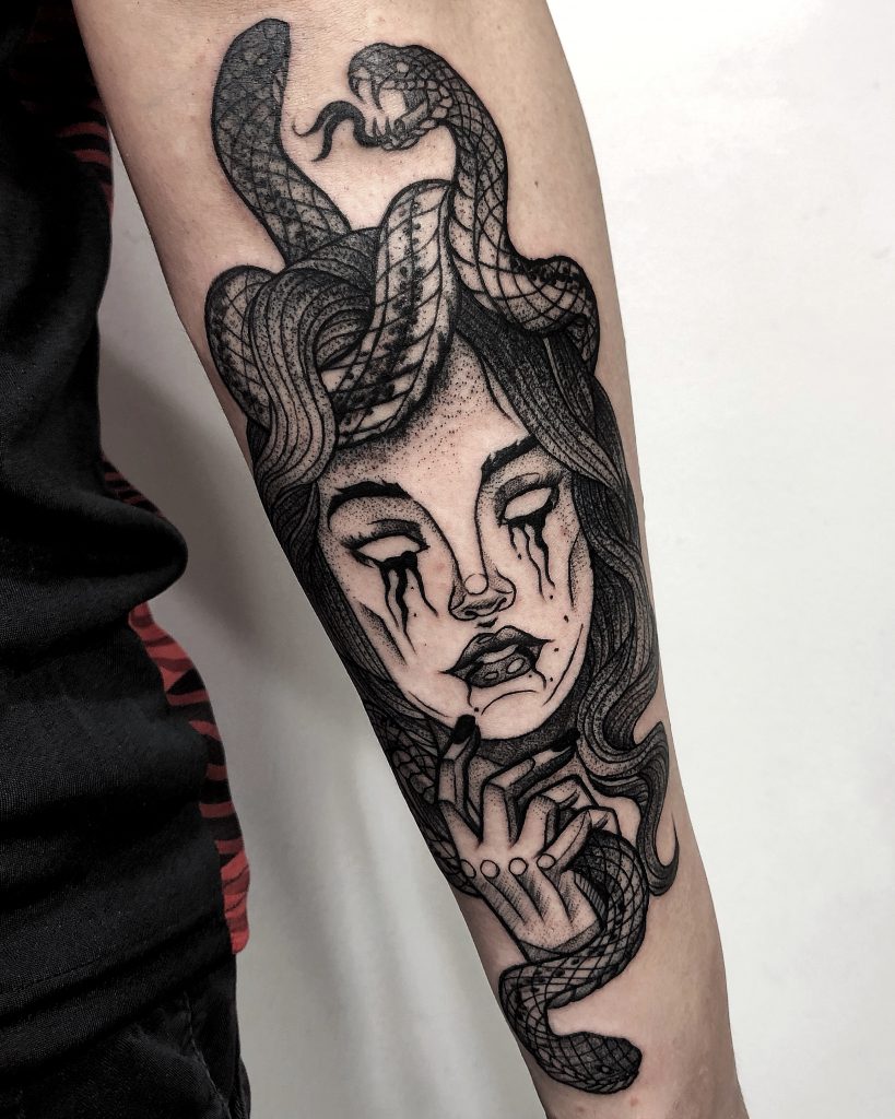 “Tatuo há 4 anos, meus trabalhos têm como temas filmes de terror, mitologias, ocultismo, misticismo… Crio composições com o compromisso de deixar tudo sombrio e obscuro!”