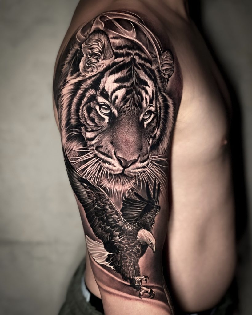 Eu sou especialista em preto e cinza. Sou extremamente focado e estou sempre buscando evoluir dentro da minha área. O que me tornou mais conhecido em meu trabalho, sem dúvida, foi minha técnica de “sombra lisa”. Adoro trabalhos com muito contraste e transições suaves, trazendo mais volume além de realismos sem marcas de agulhas para meu trabalho.