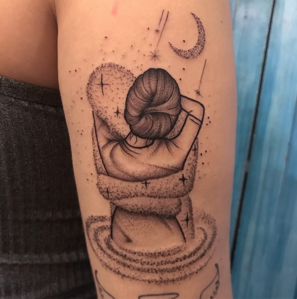 Taty Cerdeira tem 24 anos e é tatuadora há 3 anos. A artista conta que desde sempre desenhou e que, dos 11 aos 16 anos, fez curso realista de rostos: “Aos 20 anos, ganhei um kit de tatuagem da minha mãe e incentivada por ela comecei a estudar sobre a tatuagem, onde me encontrei no mundo da arte.”