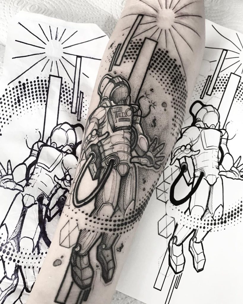 Felipe RDoze tem 30 anos e é tatuador há 4 anos. O artista começou a fazer graffiti na adolescência, se envolveu com o movimento Hip-Hop e participou de exposições e eventos de graffiti: “Comecei a trabalhar com arte, porém com muita dificuldade. Já conhecia alguns tatuadores e, por incentivo de um amigo, na época, resolvi experimentar e foi em mim mesmo que fiz minhas primeiras tattoos. Logo peguei gosto e comecei a fazer, também, em alguns amigos pra treinar. Depois, comecei atender no meu ateliê que com passar do tempo virou estúdio. Hoje em dia me dedico 100% a esse amor que tenho pela tattoo.”