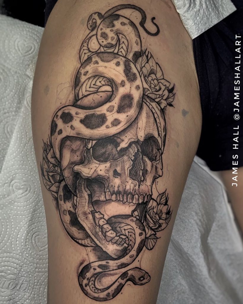 James Hall tem 23 anos e é tatuador há 4 anos. O artista conta que iniciou na tatuagem como recepcionista de um estúdio: “Com isso, me formei em design e vim estudando e aprimorando o estilo de Blackwork, Sketch e Aquarela. Gosto de integrar poucas cores para realçar algumas áreas da tattoo!”