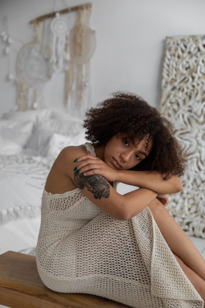 Foto de Monstera Production: https://www.pexels.com/pt-br/foto/mulher-negra-pensativa-com-tatuagem-sentada-no-quarto-5331100/