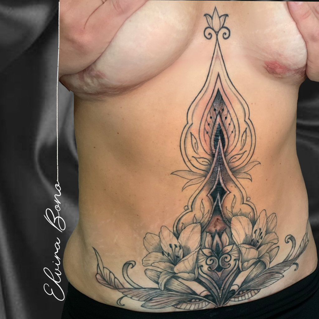 Elvira Bono é tatuadora localizada em São Paulo, com uma trajetória profissional de 17 anos que combina expertise em enfermagem e artes visuais. Ela se destaca principalmente em transformar cicatrizes em obras de arte, proporcionando aos seus clientes uma jornada de reencontro com a autoestima e confiança. Sob o projeto “Ressignificando Memórias”, Elvira utiliza uma metodologia técnica única, garantindo um serviço personalizado e sensível às necessidades individuais. Seus trabalhos refletem uma mistura harmoniosa de estilos, incluindo fineline, blackwork e watercolor, evidenciando sua versatilidade e criatividade. Para conferir seu portfólio e entrar em contato, acesse www.instagram.com/bonoelvira ou envie uma mensagem para o WhatsApp 11 995647070.