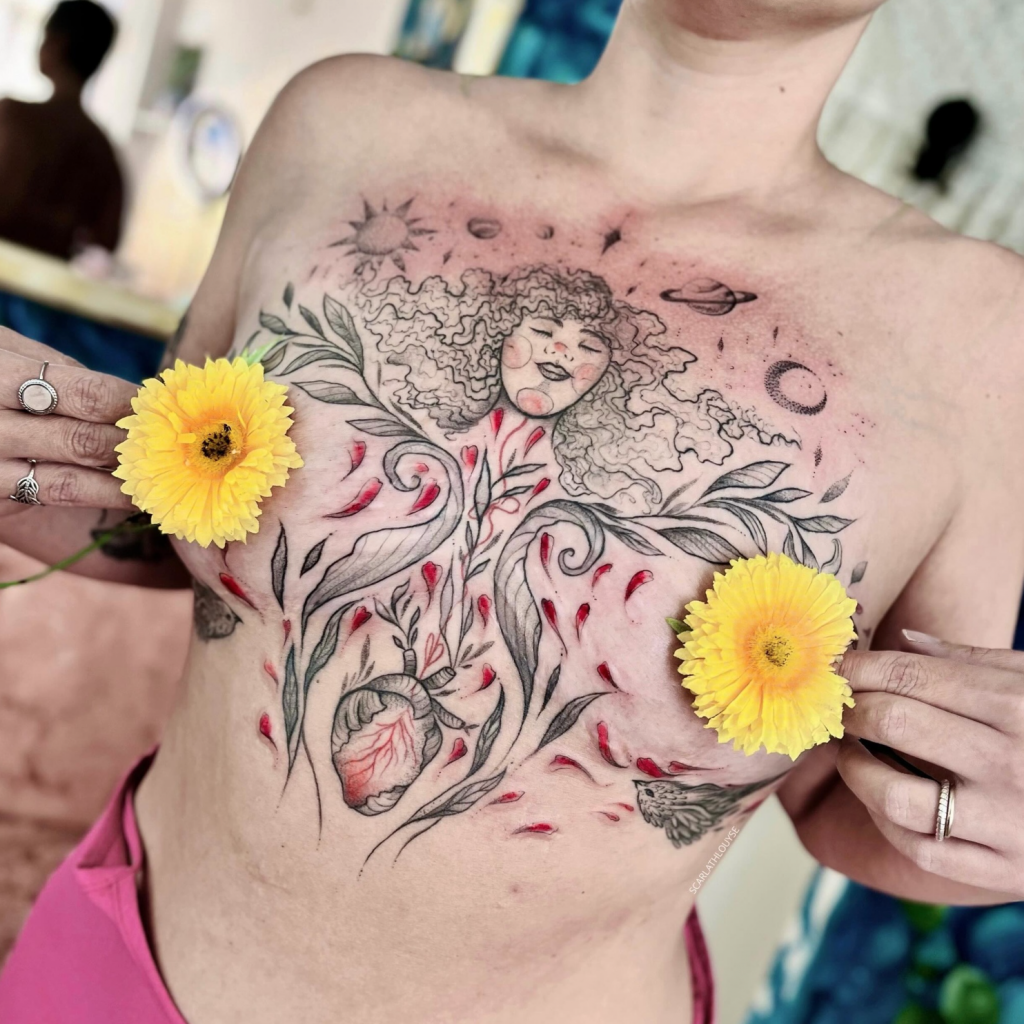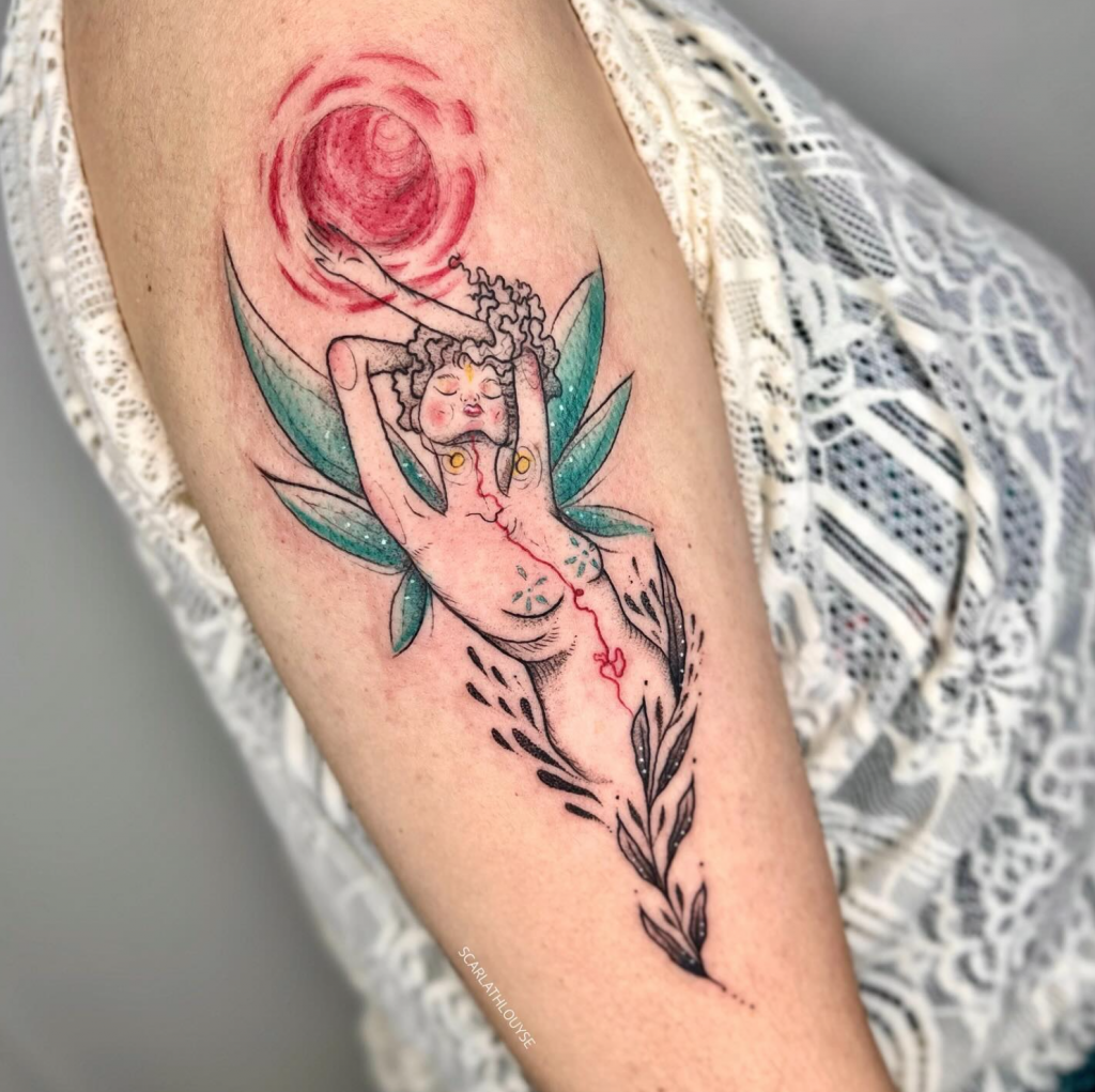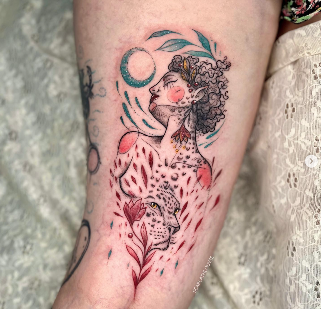 Scarlath já tatuou em diversos países ao redor do mundo, uma experiência que moldou sua arte e sua visão de mundo. “Essas experiências me amadureceram bastante e consigo ser uma artista mais versátil,” diz. Apesar de estar sempre em movimento, ela retorna ao Brasil uma vez por ano para tatuar suas clientes e manter a conexão com suas raízes. (Em seu instagram sempre anuncia as datas e as cidades com antecedência, importante acompanhar, pois é uma turnê nacional incrível passando por diversas cidades, e tenho certeza que passará perto de você.)
