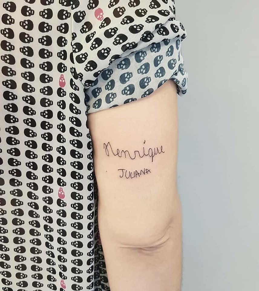 Isso mesmo, e essa escolha está cada vez mais em alta por aqui, e funciona da seguinte maneira: O cliente leva um pedaço de papel, rg, no caso de querer fazer a assinatura, um bilhete ou carta feita com a letrinha de quem ele deseja homenagear, o tatuador apenas passa o decalque em cima para sair fielmente igual e voilá… Temos uma homenagem genuinamente original! E o melhor é que dá pra fazer surpresa, sem que o homenageado precise ir junto até o estúdio para escrever o molde!