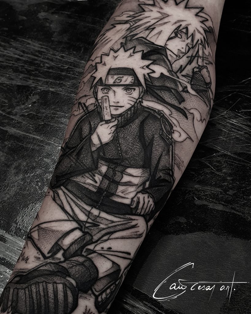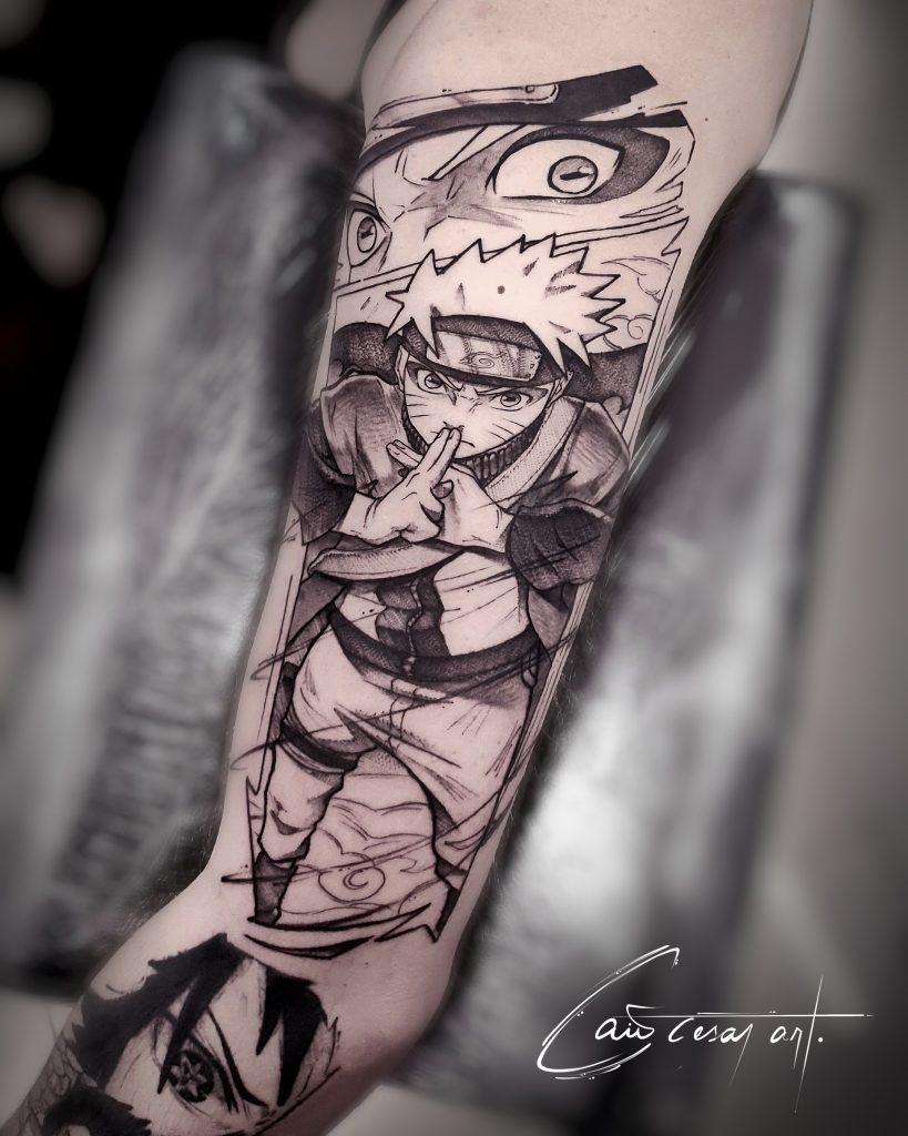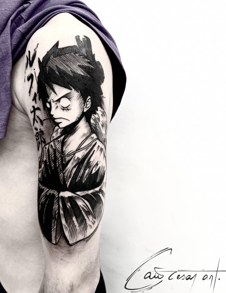 “Sinto-me atraído pelo blackwork e tento trazer elementos de mangás e ilustrações para dentro da tattoo de uma maneira que pareça natural”, compartilha o artista em seu Instagram @caiocesar_art.
