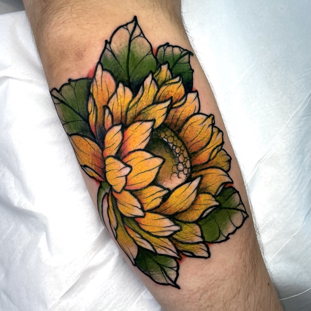 “Nas minhas sessões, é comum o(a) cliente ter um dia de “princesa(o)” hahaha, geralmente são sessões que tomam um dia de trabalho, pois começamos o dia com a sessão de freehand, onde discutimos sobre o desenho e desenhamos direto na pele, com o cliente de acordo, é feito uma pausa (almoço, lanche, café..) e depois voltamos para a sessão de tatuagem que pode durar de 2 a 4h.”