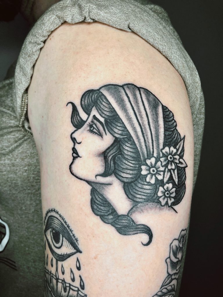“Formada em artes plásticas, maquiadora artística de bodypaint e tv, professora de técnicas de Luz, sombra e pintura realista na maquiagem. Durante minha carreira na maquiagem sempre me perguntaram o porque não tatuava, no início da pandemia resolvi dar uma oportunidade a área e me apaixonei Inspirações: Oozy, Morrigan e irmãos Murray.”
