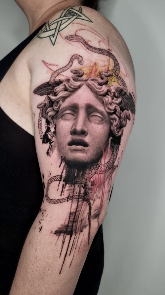 Paulo transforma mitologias e arquétipos em tatuagens com estética forte e linguagem própria. Suas criações combinam blackwork fluido com traços influenciados pelo Neotradicional, sempre buscando significado e impacto visual.