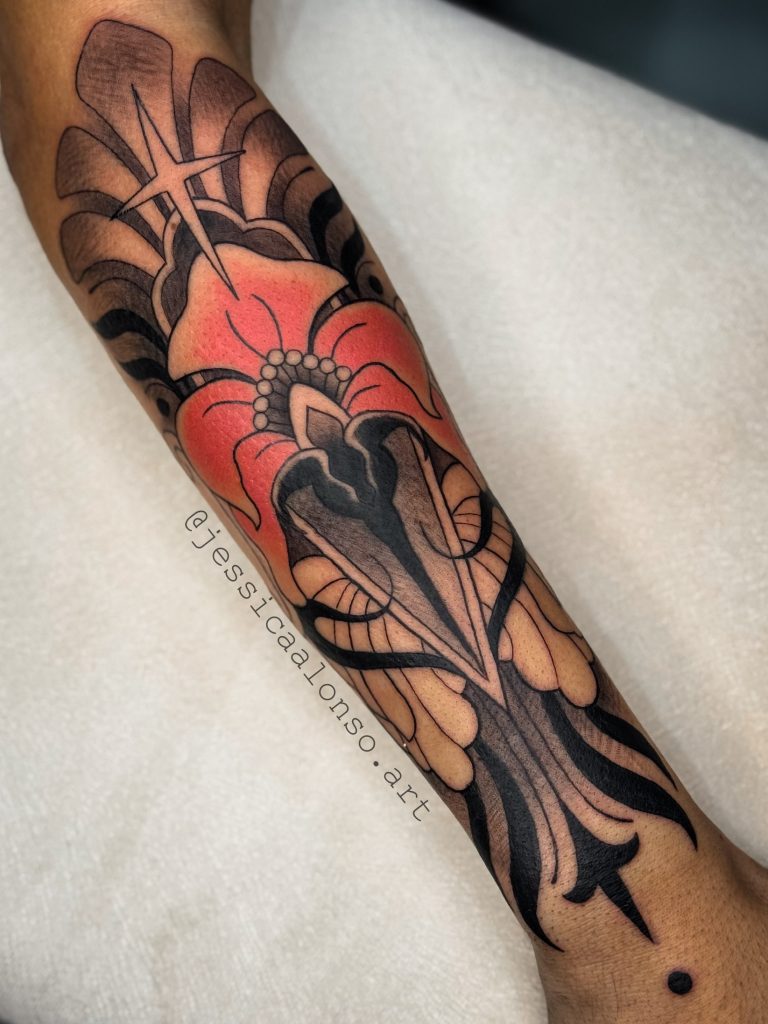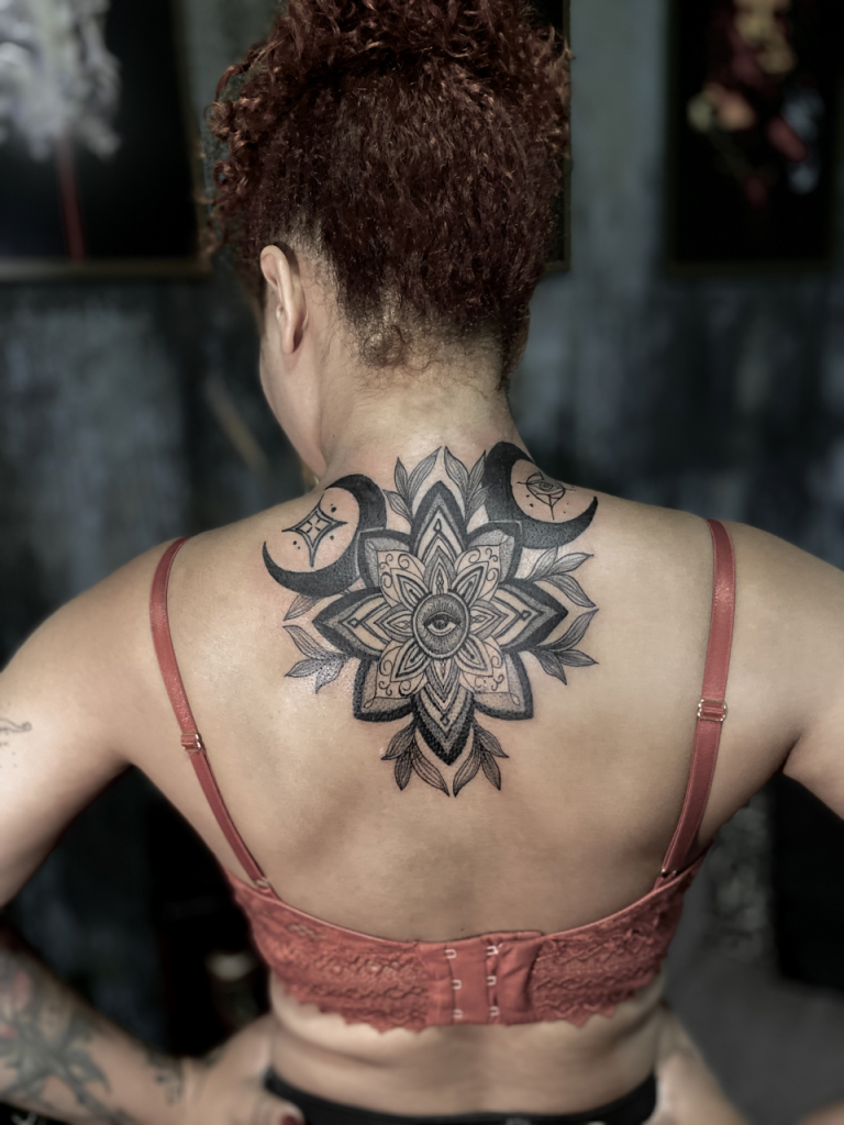 Aline encontra brilho na conexão com mitologia e entidades. Suas criações são imersões simbólicas e viscerais, que transformam arquétipos e histórias antigas em arte viva. Cada tattoo nasce de um estudo profundo e sensível.