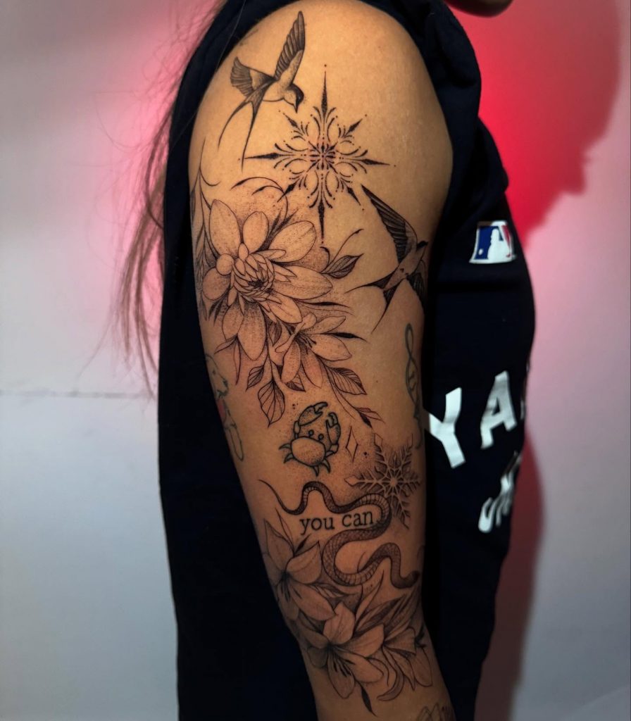 Maya Serejo brilha com delicadeza e sensibilidade. Seu estilo fineline é tratado com esmero, buscando sempre a leveza dos traços, a fluidez da composição e a elegância nos sombreados sutis. Cada projeto é pensado sob medida, respeitando a identidade de quem o carrega. Ela ama tatuar flores, composições cinzentas e até temas inspirados em filmes, séries e animes. O cuidado, o respeito e a vontade de representar cada cliente com fidelidade fazem parte do seu propósito. Conheça esse talento e se encante com sua arte única.