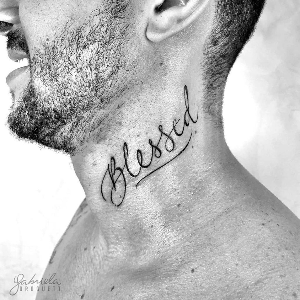 A tatuagem “blessed” que significa “abençoado” em português é uma forma de positiva de encarar a vida ao se sentir privilegiado ou sortudo. É uma forma de transmitir para a pele todo o agradecimento pela vida, e pelas coisas positivas que a vida traz.