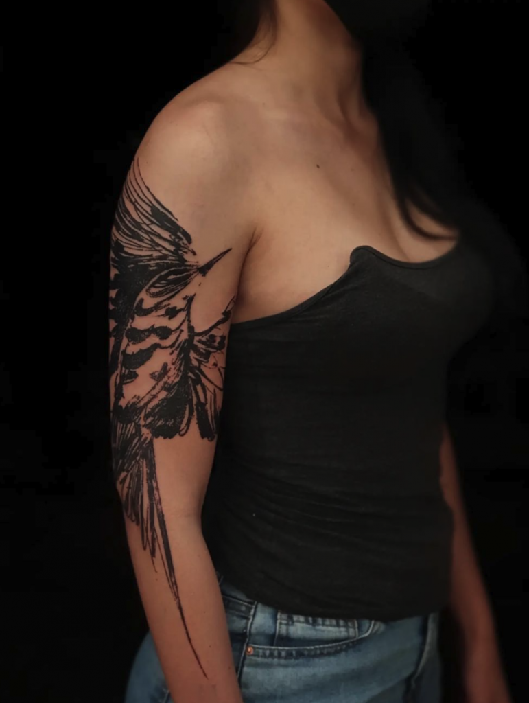 Sua inspiração vem do gestual abstrato, da anatomia do corpo e dos conceitos/histórias que fazem parte da vida de seus clientes, o que faz com que cada trabalho seja totalmente personalizado e inédito.