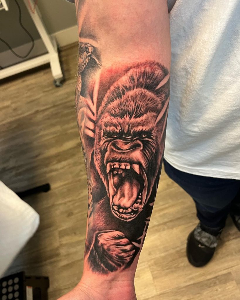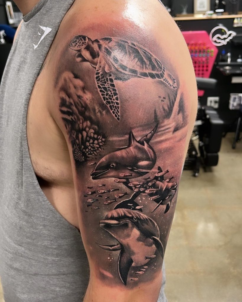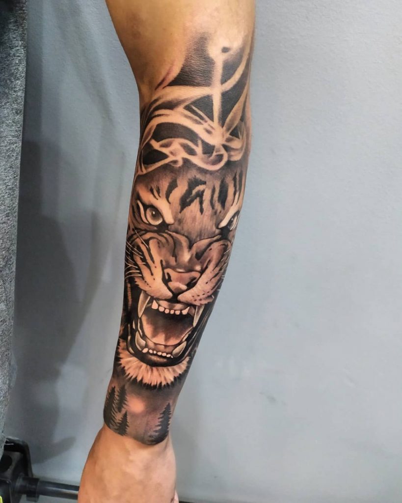 Carlos: Meu estilo é o preto e cinza, dentro do estilo já tatuei de tudo. Gosto de pontilhismo, e também já fui premiado na categoria, mas o realismo preto e cinza se tornou muito popular e procurado. Teve uma época que tatuava quase todo dia leões, lobos, animais…acho que todos tatuadores no estilo tiveram essa fase.