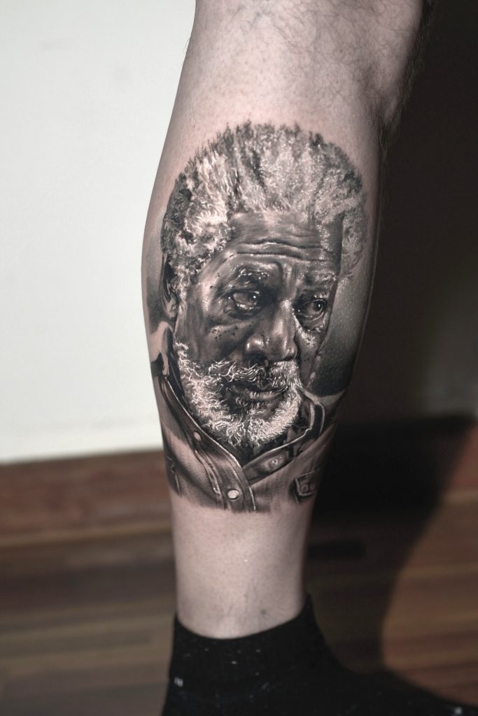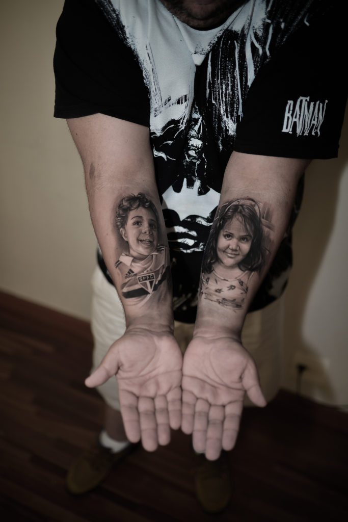 Ramon: Me procuram muito para fazer realismo em preto e cinza. Portrait (fotografia, rosto), micro realismo, que são tatuagens realistas bem pequena, e fotografia de animais.