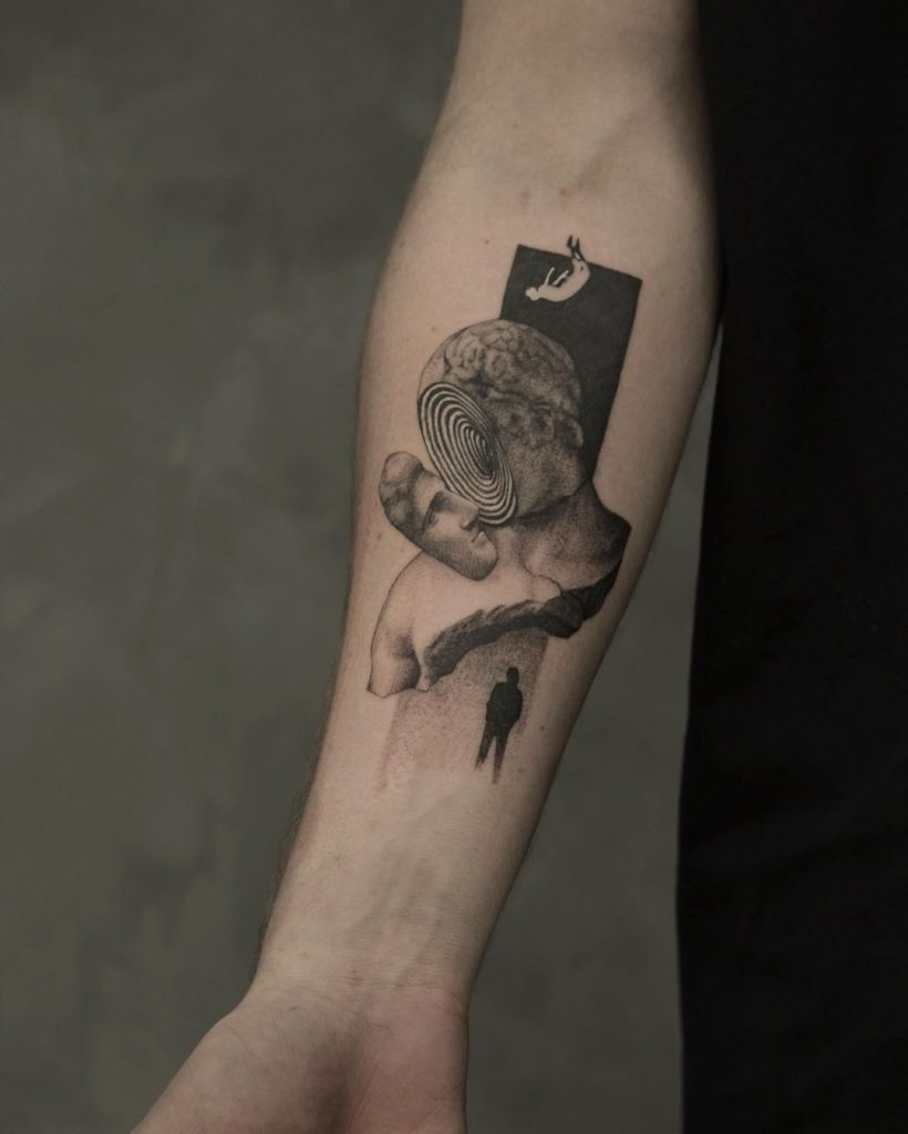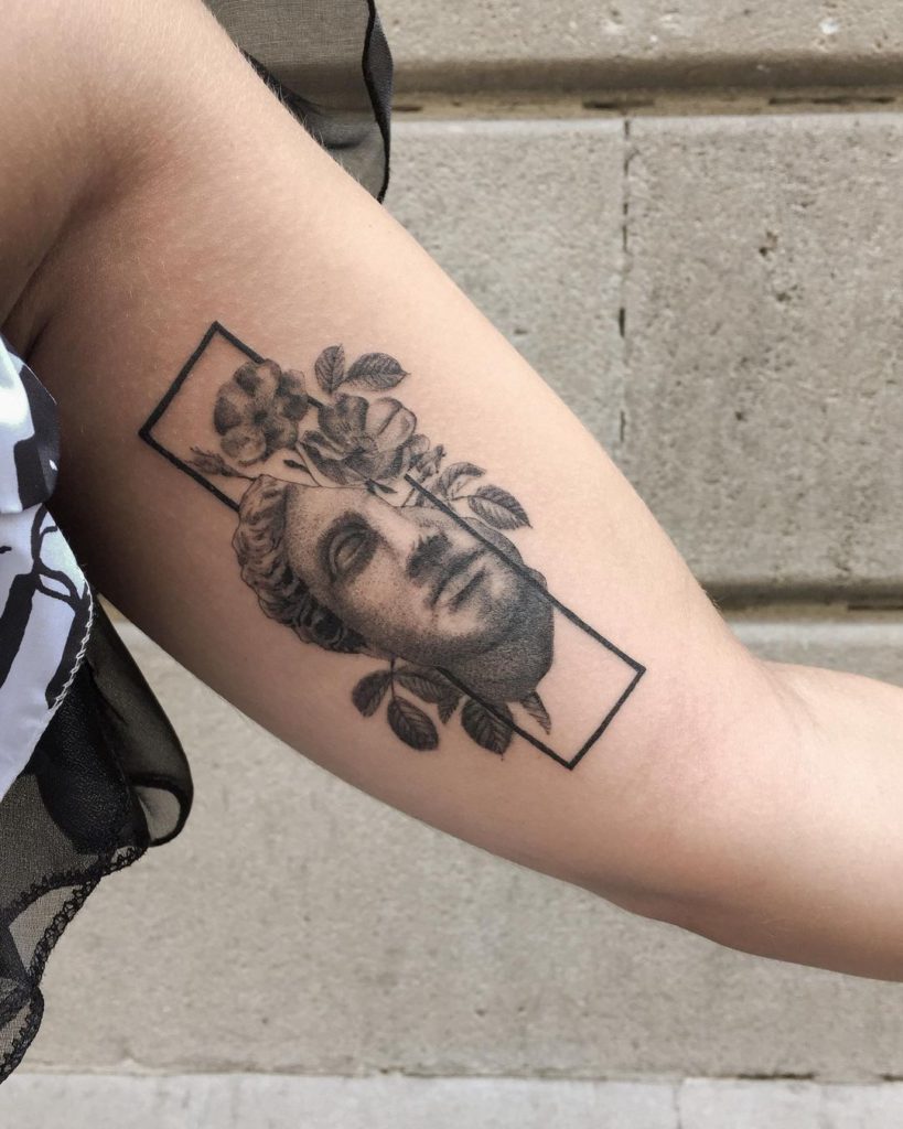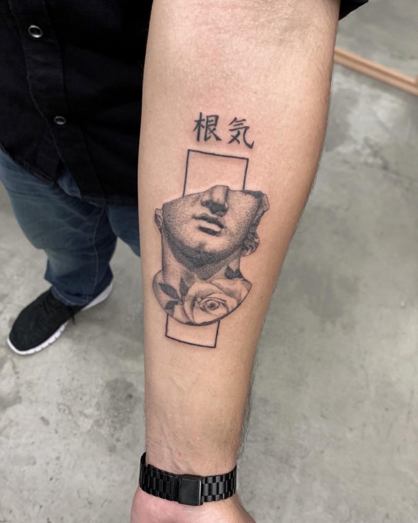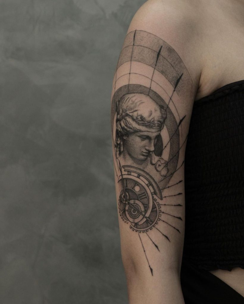 Iuri: “Atualmente eu me dedico bastante para fazer estátuas, gosto muito de como elas são e o flerte com o belo e o frio que elas trazem é lindo para mim, mas eu gosto de tatuar estátuas que ninguém conhece ou são pouco conhecidas, as clássicas como o Poseidon ou David eu faço bastante também, mas normalmente me procuram para as mais diferentes.”