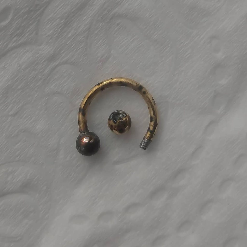 Eu acredito que morre um panda, daqueles bem fofinhos, toda vez que alguém usa jóia banhada para perfuração inicial de um piercing. Ok! Pode até ser que não seja verdade essa história do panda fofinho, mas o que acontece de verdade você pode conferir nessa foto aqui abaixo: