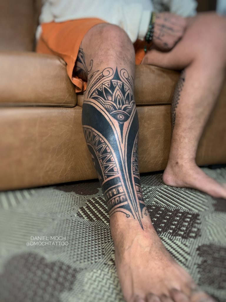 Daniel Moch, ou como é conhecido no Instagram, @dmochtattoo, é especializado em estilos de tatuagem ornamental, grafismo e blackwork. “Meu trabalho é inspirado nos meus estudos em ornamentação e padrões geométricos do Kemet (Egito Antigo), além de grafismos de diversas culturas predominantemente em tinta preta”, diz Moch.