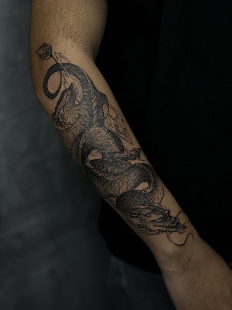 Para Eric, cada cliente é uma tela única que merece uma obra de arte personalizada. “Trabalho sempre em conjunto com os clientes, através das referências que mandam e suas ideias,” diz ele. Nessa colaboração, a visão do cliente é combinada com a habilidade de Eric, dando origem a tatuagens verdadeiramente excepcionais. Ele acredita que cada detalhe importa – sombras, contrastes, linhas – e incorpora esses elementos de maneira magistral em suas criações.