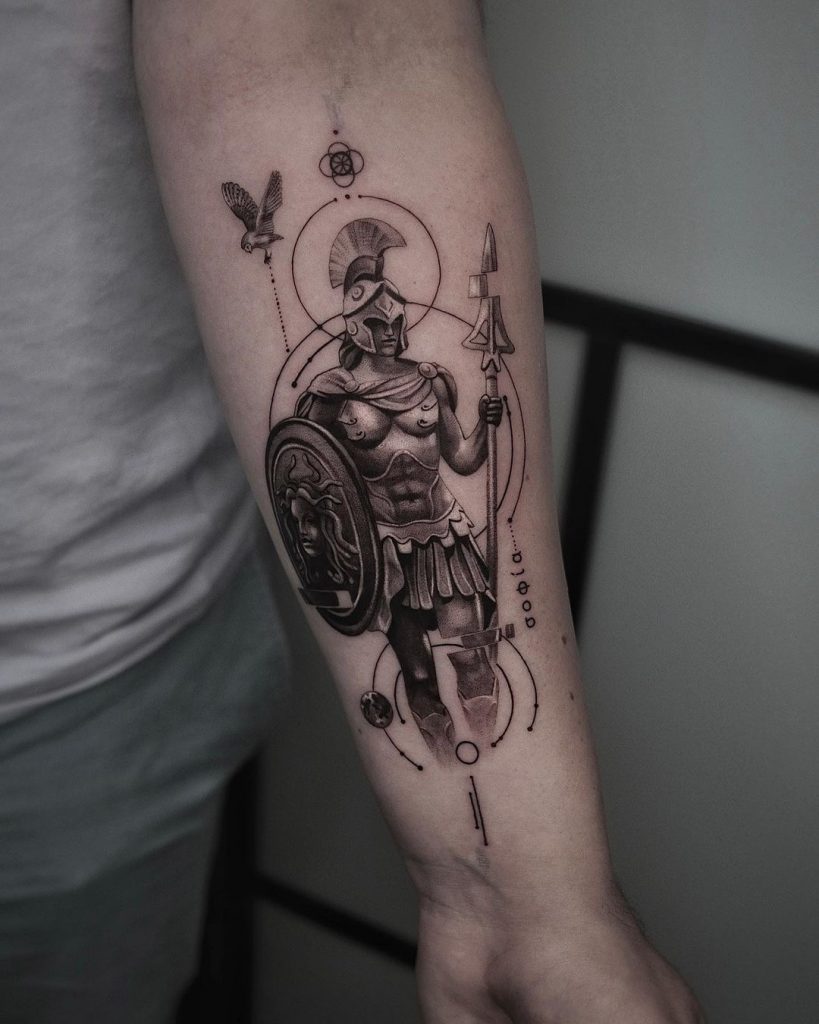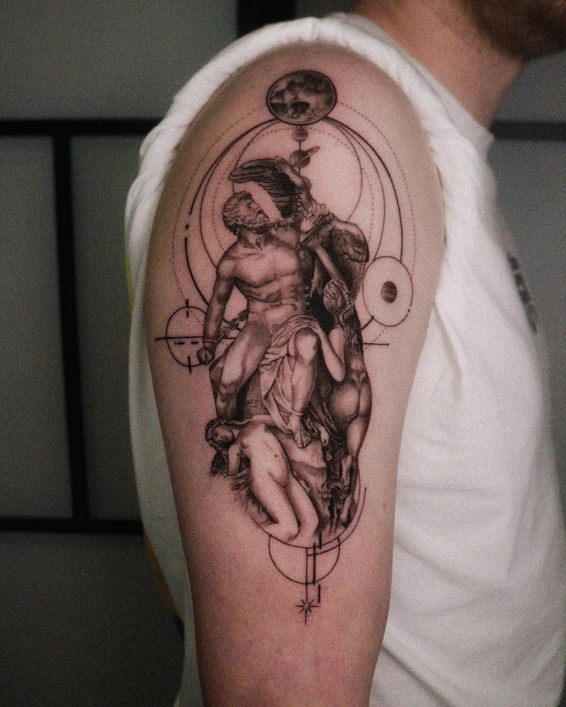 Trabalhando atualmente em Exeter, Devon, Eron não se limita a reproduzir imagens, ele cria narrativas na pele de seus clientes. Mescla referências de diversas artes, como colagens e grafismos, tudo embalado pela mitologia grega, uma paixão que despertou em sua formação, como discípulo do curso de Charles Bargue.