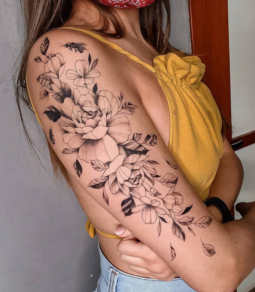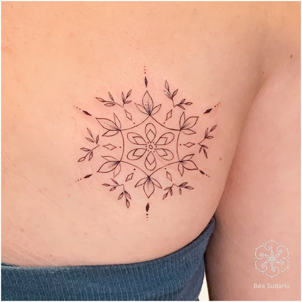 “Eu sou a Mari, me formei em design de moda e fui parar na tattoo por acaso, já que no início não conhecia ninguém da área. Já são 4 anos me dedicando totalmente a tatuagem. Trabalho no estúdio Flor da Pele Tattooaria, do qual eu sou sócia, e é um estúdio integrado somente por mulheres. Meu principal foco na tattoo são fineline, blackwork e coloridos delicados.”