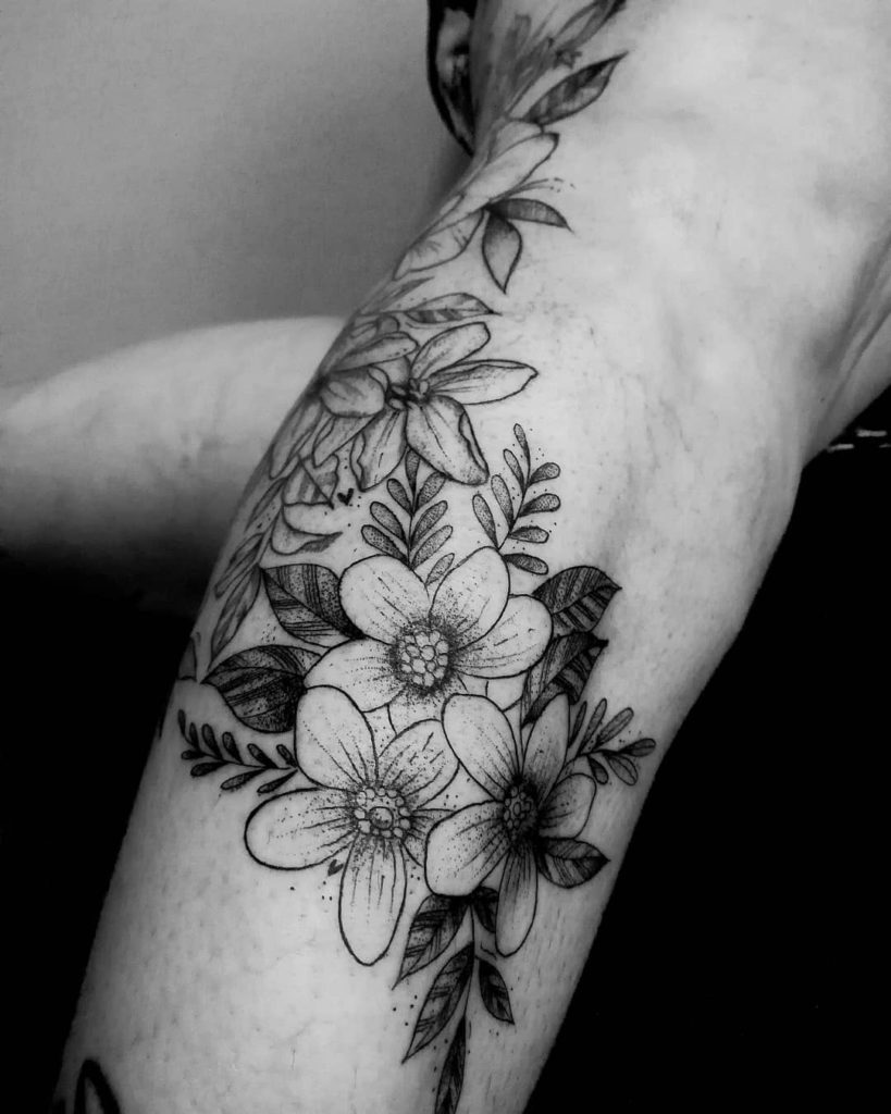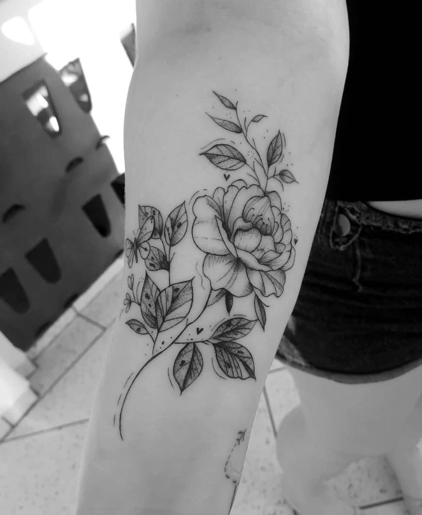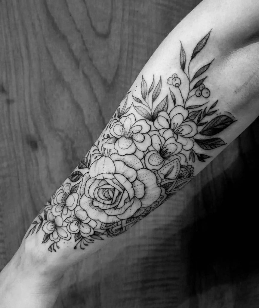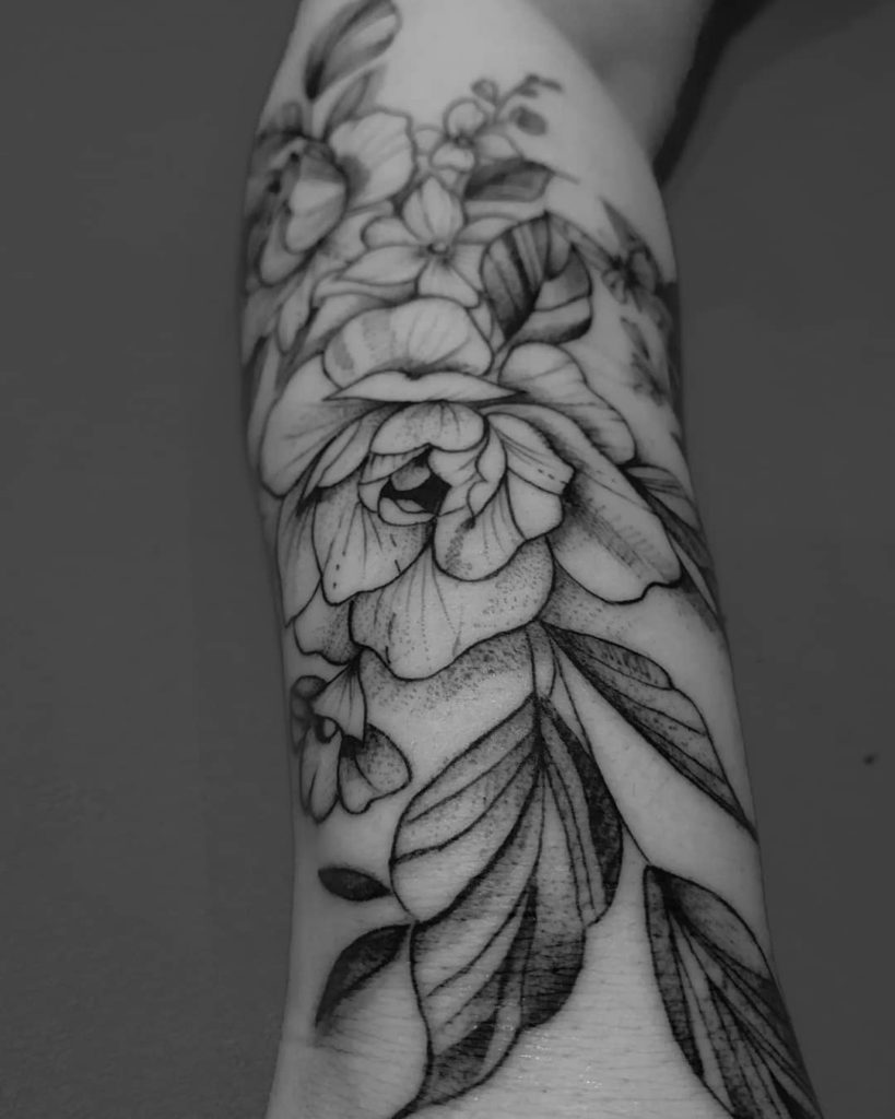 “Sobre o processo criativo, começo quase todos os meus dias cuidando das minhas plantinhas, observando que forma eu posso aplicar essas estruturas tão perfeitas e harmônicas no papel e posteriormente na pele, então vem algumas fotografias logo em seguida alguns esboços no papel, depois o aperfeiçoamento das linhas e finalmente o desenho vira uma linda tatuagem.