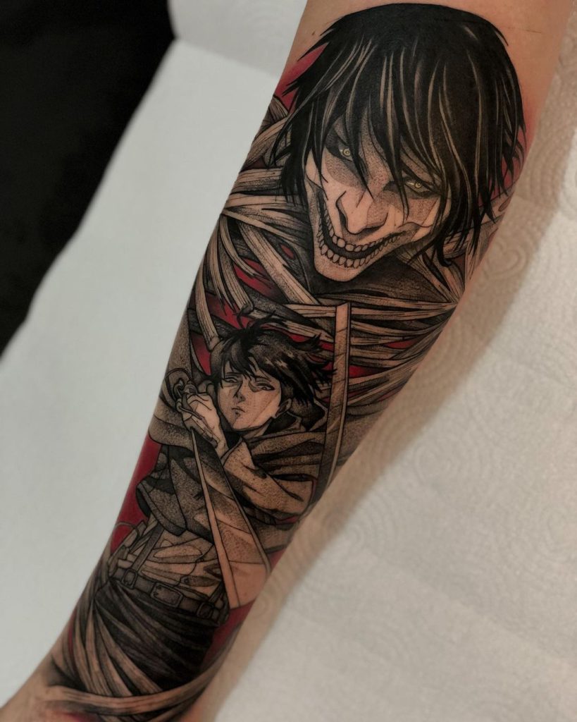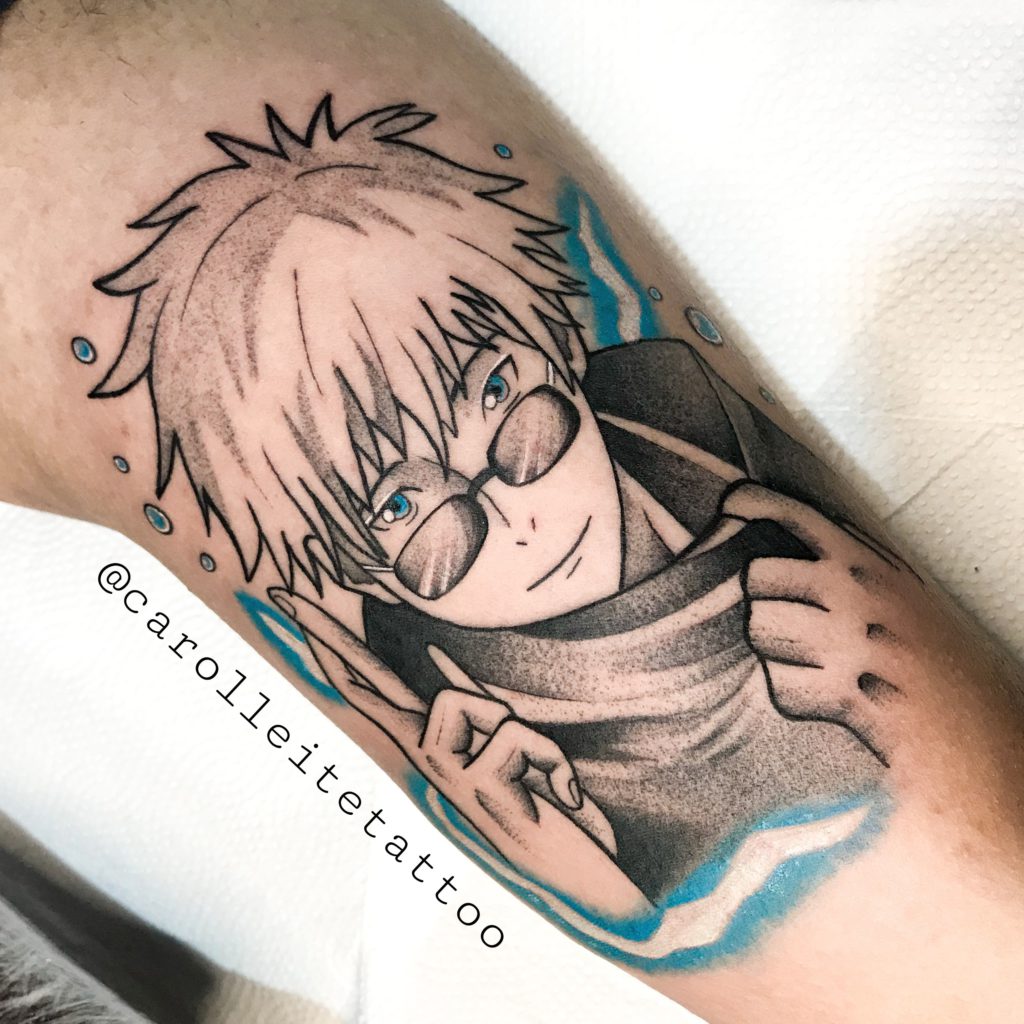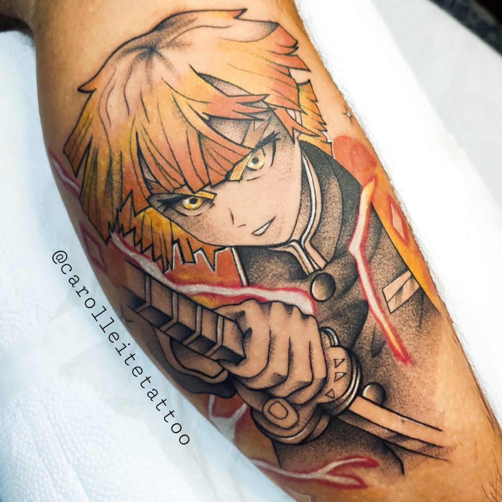 “Desenho desde muito criança. Fiz um curso de desenho de mangá quando tinha 11 anos, pois fui sempre muito interessado em animes e desenhos animados, assim como na cultura japonesa. Sempre gostei de tatuagem, mas só pensei em começar a tatuar por incentivo de outros tatuadores, que faziam em mim os desenhos que eu criava. Esse ano completo 7 anos desde que comecei e 6 anos desde que trabalho oficialmente como tatuador. Hoje sou mais focado no estilo geek, principalmente animes, mas comecei no blackwork. Grandes inspirações pra mim, foram @felipecesar.me e @grindesign. Sempre busco inspiração em artistas como @gtakazone, @diegoshogun, @willb_tattoo @doug.tattoo, @simonkbell, entre vários outros. Gosto de ser bem fiel aos personagens, buscando referências nos mangás e cenas dos animes, em imagens oficiais de jogos, e até em action figures (as quais coleciono) para fazer uma composição que encaixe em uma ideia minha.”