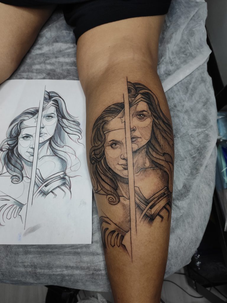 “Formada em engenharia civil, não me sentia realizada profissionalmente e me sentia perdida no mercado de trabalho. Encontrei na arte, uma forma de expressar o amor que tenho por jogos e animes, dentro dessa etapa de conhecimento, tive a oportunidade de fazer cursos de tatuagem e iniciar na carreira de tattoo no final de 2020. Hoje com 6 meses de experiência me sinto totalmente realizada trabalhando com temas geeks. No mês de maio recebi a grande oportunidade de iniciar as atividades em um estúdio, Stúdio Campo Santo que hoje tem 2 locais de atendimento em Maringá. Minhas inspirações são Vinicius Menoli, Léo Dionizio tattoo, Lauren Hepple, Roody Artes e Claudia Denti tattoo”