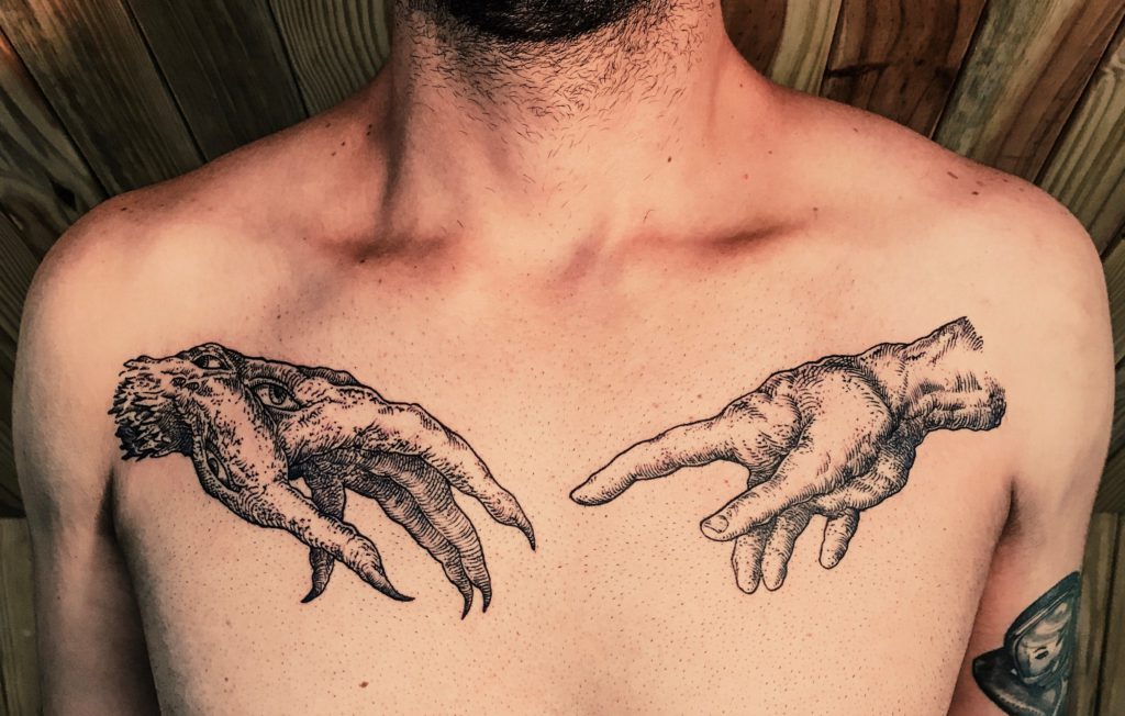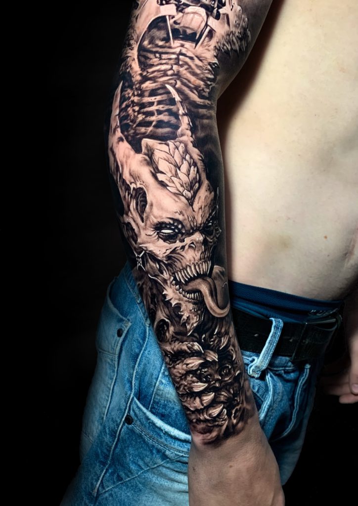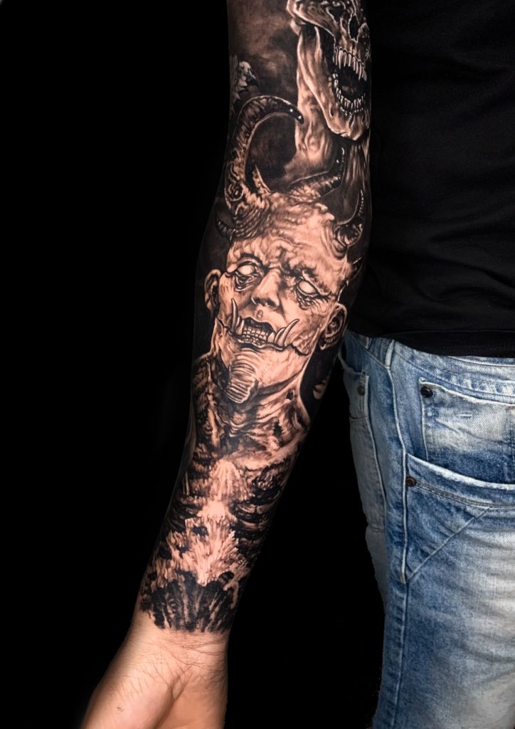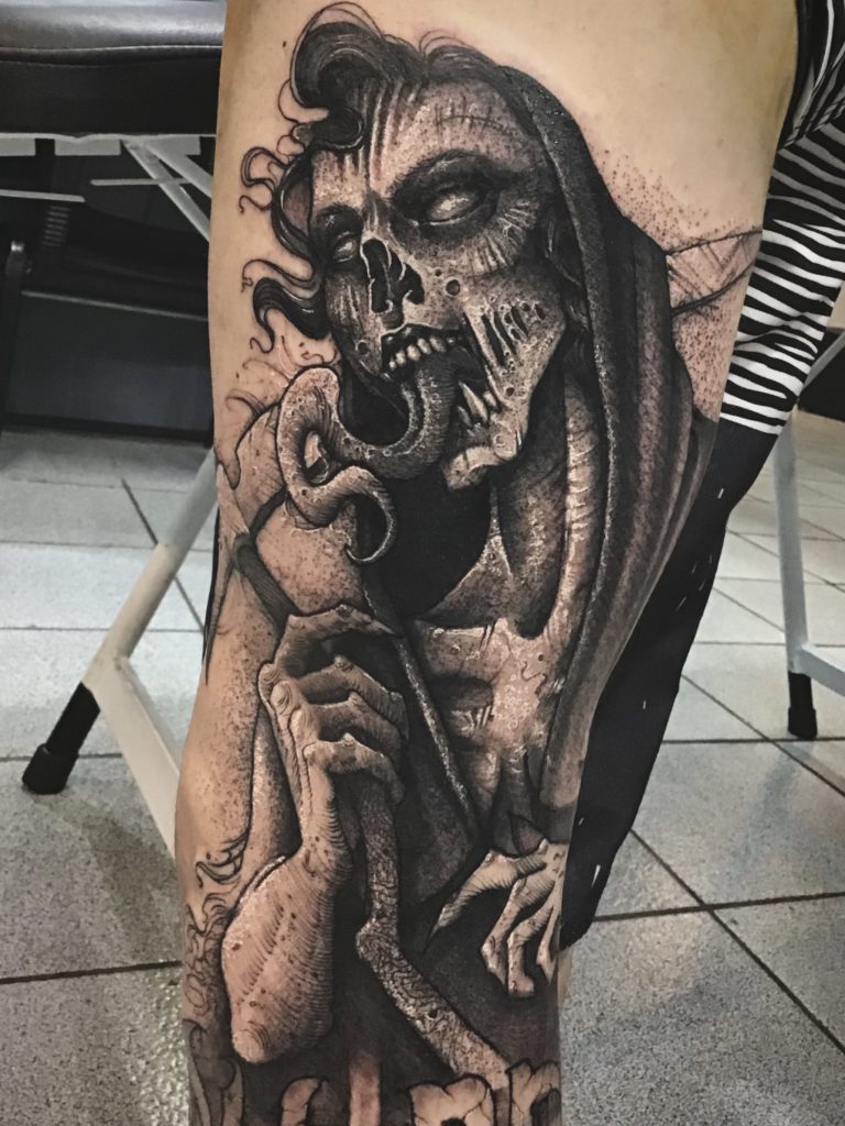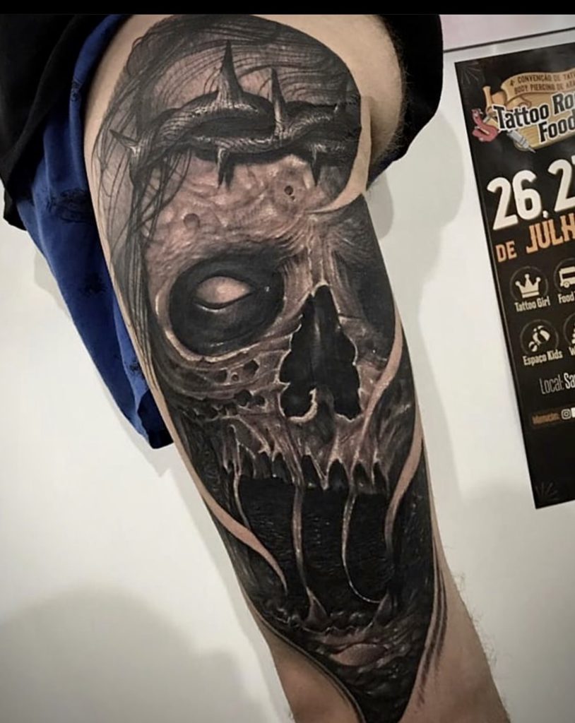 Conheça agora a história da trajetória do artista Marcelo Machado: “Sempre tive muita atração por desenho e arte, venho de uma ramificação da arte que é o grafitti e vim parar na tattoo onde estou a 4 anos, gosto muito de provar todos os estilos e busco sempre aprender mais, mas dentre esses from hell e blackwork são os estilos que recebem mais minha atenção, com tanta referência e toda facilidade que as redes trazem hoje seria injusto citar alguma inspiração aqui, penso que tudo é referência e experiência.” Abaixo artes incríveis no tema para vocês!