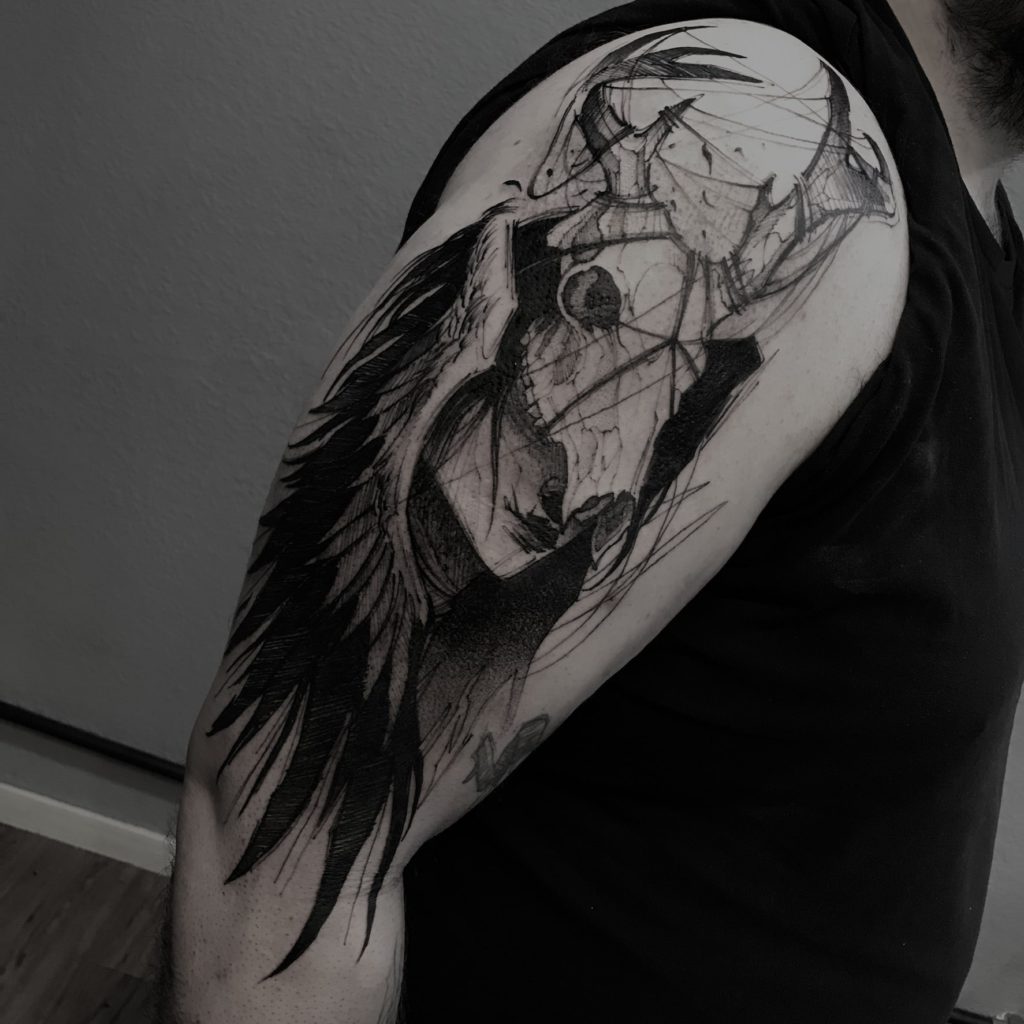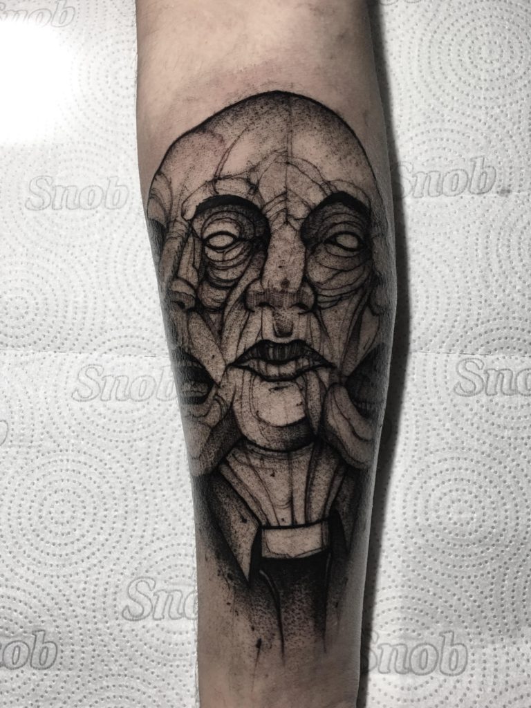 “Sou tatuador a 8 anos. Sempre gostei muito de tatuagens desde pequeno. Meu primeiro contato com a tatuagem foi através de meu pai, quando eu tinha uns 10 anos, meu pai decidiu fazer sua segunda tatuagem, marcou em um estúdio tradicional em São Paulo e me levou, fiquei apaixonado por tudo aquilo, todos os sketchbooks, a decoração do estúdio, queria muito fazer parte, mas parecia muito distante. Aos 17, não tinha dinheiro e nenhuma remuneração, abri um aparelho videocassete velho de casa, peguei o motorzinho e junto a uma lapiseira, montei uma máquina caseira e me tatuei com nanquim (a tatuagem, se é assim que da para chamar, como de se imaginar, ficou terrível), a partir desse momento, decidi que era isso que queria seguir. Aos 18 Arrumei um emprego e a partir daí comecei a investir em estudos e equipamentos, de lá para cá, testei vários estilos de tatuagem, mas o que mais me pegou foi a linha que sigo do blackwork e from hell, sempre tirei inspirações em capaz de discos, hqs, mangas, filmes e afins. Tenho como inspiração muitos artistas, cada dia conheço um novo (rs) . Entre os tatuadores mais conhecidos, tenho grande inspiração nos trabalhos de Robert Borbas e Brandon Herrera . Sempre busco referências também em trabalhos de xilogravura, como Gustave Doré.”
