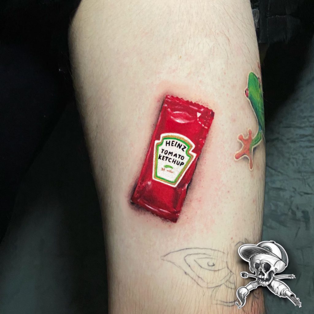 “Bah! O pessoal me perguntam muito sobre os adesivos como o Sachê de Kectchup, o KitKat e outros!! São tattoos em realismo que acabam fazendo sucesso por onde passam, já tive clientes parados na rua para perguntarem se era mesmo um adesivo colado na pele ou uma tatuagem.”