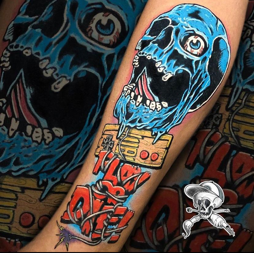 “Lá pelos anos 2000, quando eu tinha uns 15 anos, conheci o trabalho do Daniel Toledo, que montou seu estúdio na rua Carumuru, a mesma em que eu morava, em Canoas/RS. Alí a tattoo começou a me chamar a atenção, ficava impressionado com as artes dele, fora do comum. Ele desenhava com canetinha direto sobre a pele da pessoa e resultava numa “baita” tattoo, bem diferente dos tatuadores convencionais que eu conhecia na época, que usavam as revistas para tatuar, e acabavam replicando a mesma “arte” sem personalidade.