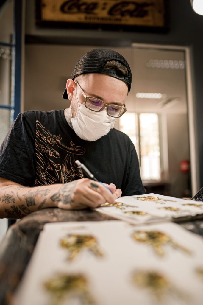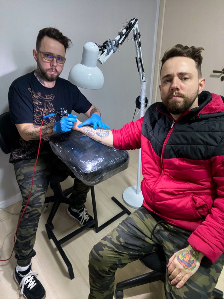 Nessa caminhada da Tattoo, tatuei junto do Rapha Bona que me ensinou muito e ali ganhamos a confiança um do outro. O Bona foi para Luxemburgo tentar uma vida nova com sua família e por lá conheceu o Ben, dono de um estúdio de tatuagem e loja de CBD em Luxemburgo. Através do Bona, o Ben conheceu o meu trabalho e me convidou a passar 3 meses tatuando com eles. Foi uma baita experiência, tatuei muitas pessoas de outros países, aprendi sobre a cultura e principalmente perceber a essência por trás de cada tatuagem. Ao final dos 3 meses, voltei para o Brasil com um vínculo criado, mantendo uma frequência de períodos de guest por lá.”