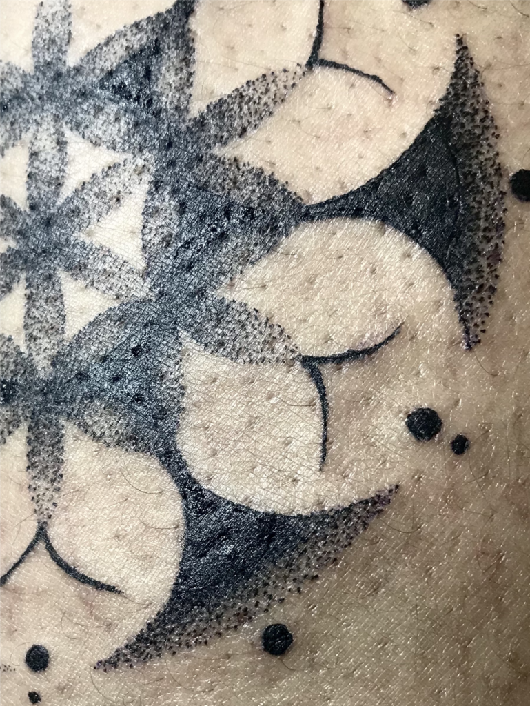 Há alguns anos atrás, em 2015 para ser mais exata, eu iniciei uma jornada no universo da geometria e, foi ao longo do ano de 2020 que me permiti traduzir algumas dessas formas intuídas também nas tatuagens.