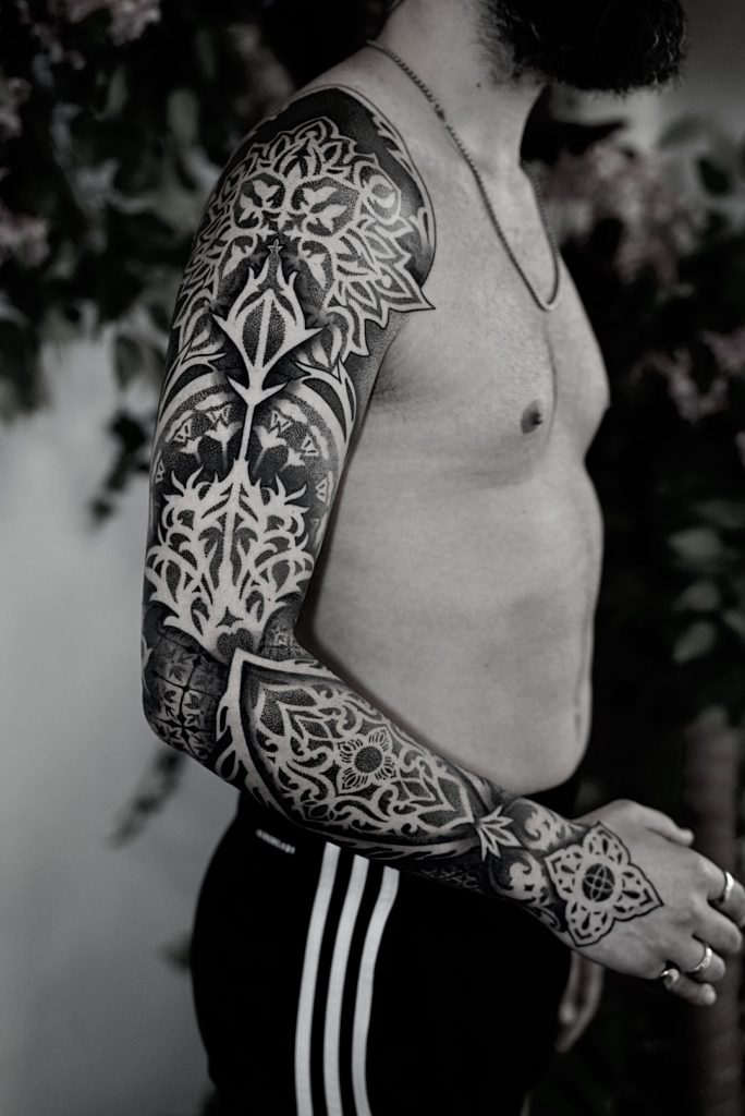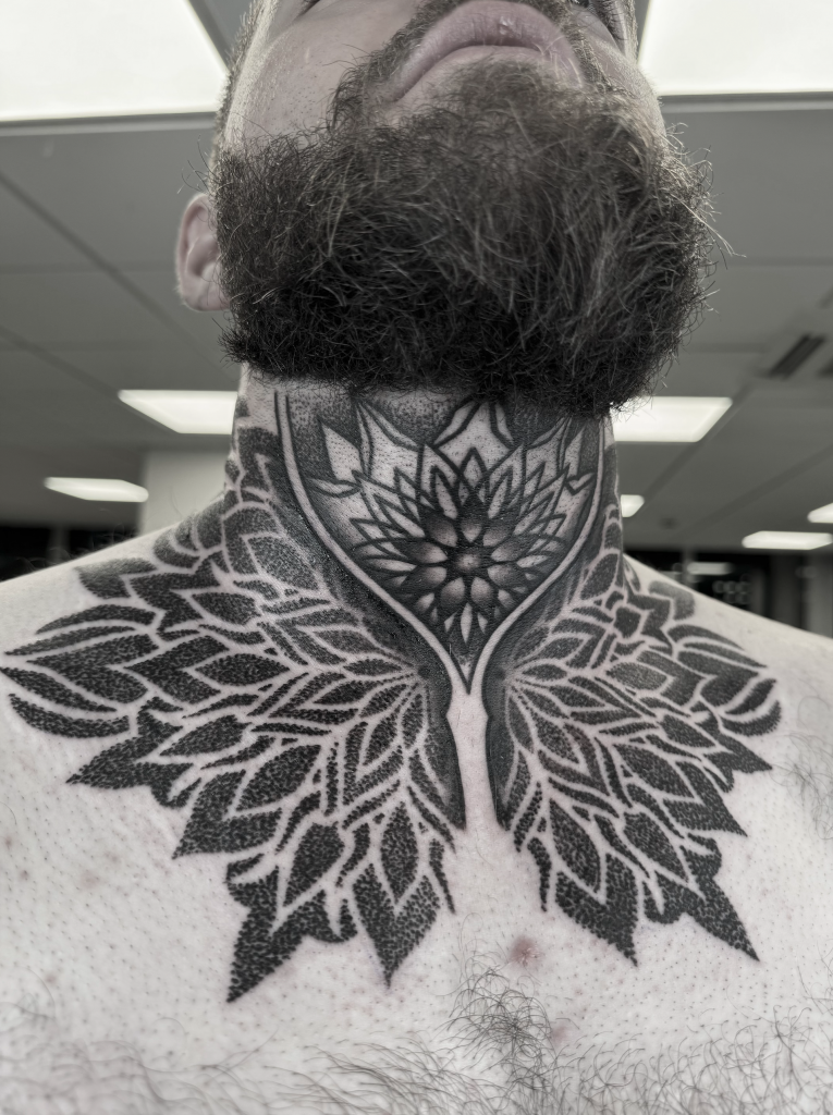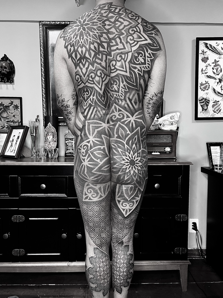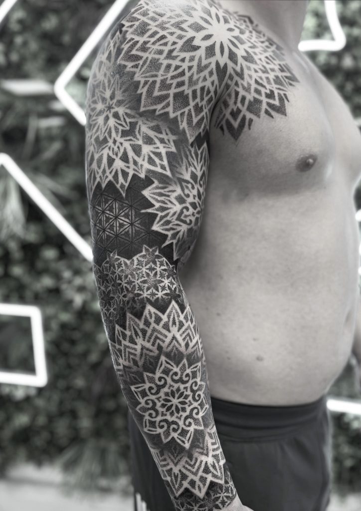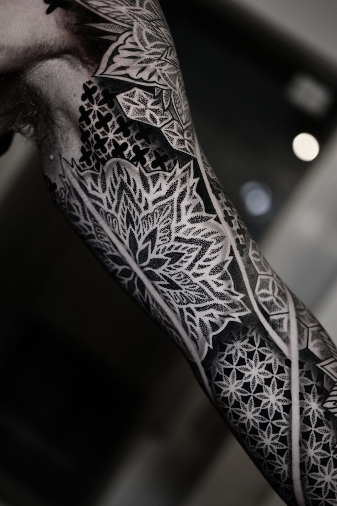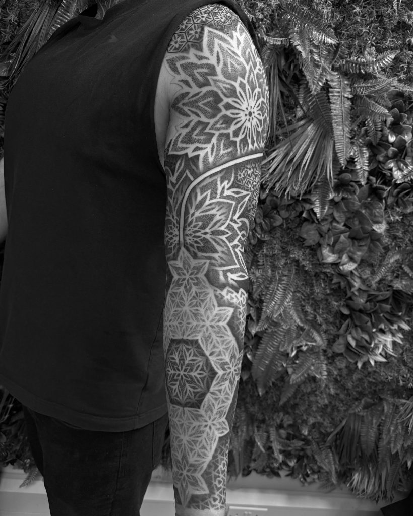 Mas, como em todo começo, houve desafios. “Quando comecei a tatuar em 2009, eu senti muita dificuldade em me inserir na comunidade da tattoo. Eu era muito novo e a comunidade de tatuadores era fechada.” Ainda assim, com o tempo, Leonardo foi conquistando seu espaço. Aos poucos, seu estilo foi se definindo, e ele passou a se especializar em estilos como o Old School, Neo Trad, Geek e Geométrico/Mandala, uma evolução natural do seu gosto pessoal: “O que me atraiu para a tatuagem foi o clássico (Old School), muito por ter linhas firmes e cores vibrantes. Os clientes foram vendo minhas linhas e composição e foram me escolhendo para mandalas e line work.”