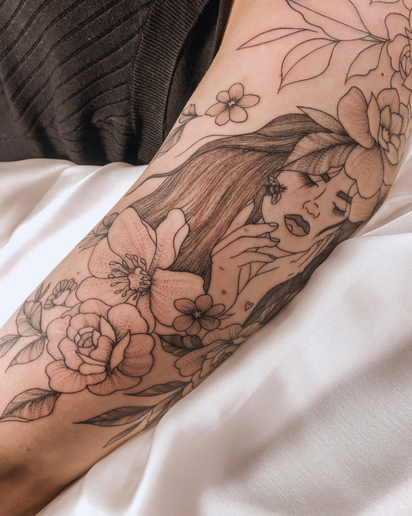 Ela se lançou na jornada, arregaçou as mangas e correu atrás de suas aspirações. Seis anos depois, Mari tornou-se não só uma tatuadora excepcional, mas também co-fundadora do estúdio Flor da Pele Tattooaria. Ali, ela divide espaço com outras mulheres artistas incríveis, em um ambiente que valoriza a criatividade, a individualidade e o apoio mútuo.