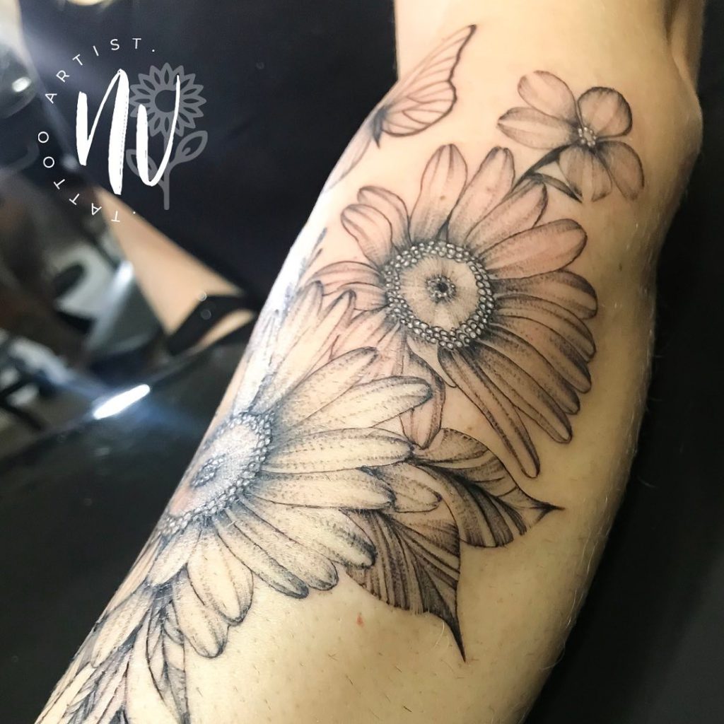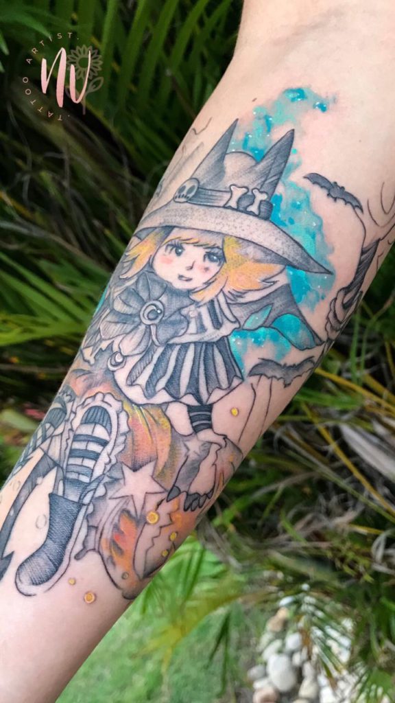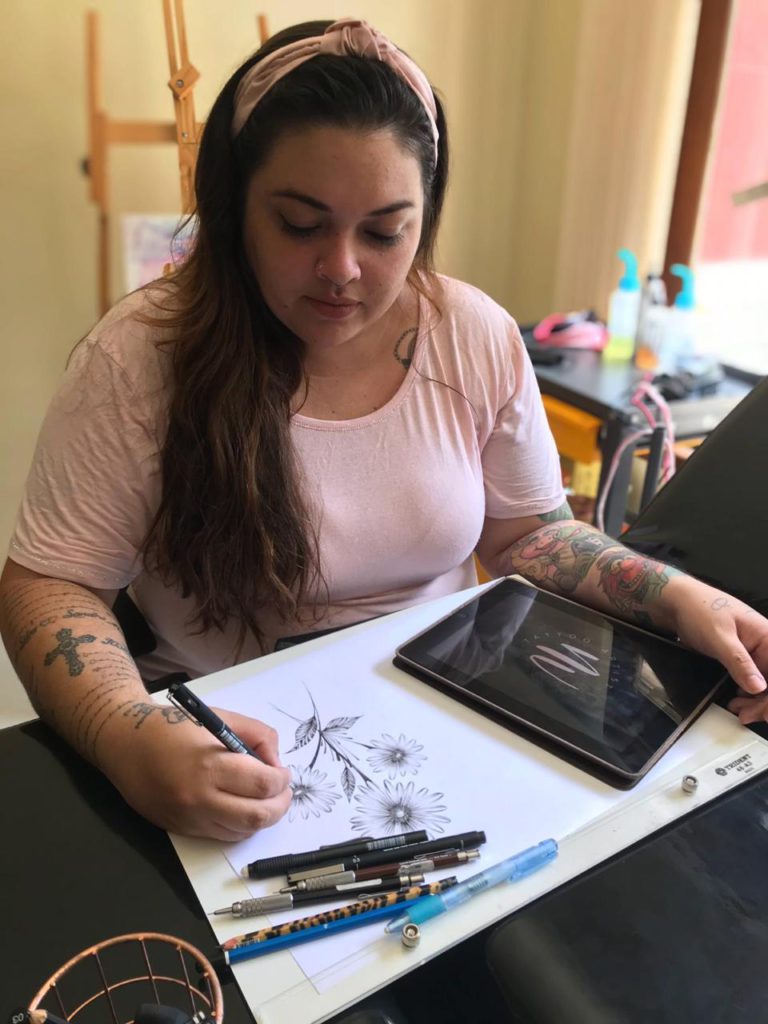 “Diferente de muitos artistas eu nunca tive uma relação muito íntima com a arte, me descobri em um momento muito difícil que foi a partida da minha mãe. Nos meus momentos depressivos eu tentava desenhar algo para tirar o foco da minha tristeza. Era como se fosse algo terapêutico rsrs. Meu esposo já tatuava a um pouco mais de 10 anos e começou a me incentivar, porém o meu emocional não permitiu que continuasse. Desisti por duas vezes, até que em 2018 tomei uma decisão de seguir em frente e comecei a tatuar“