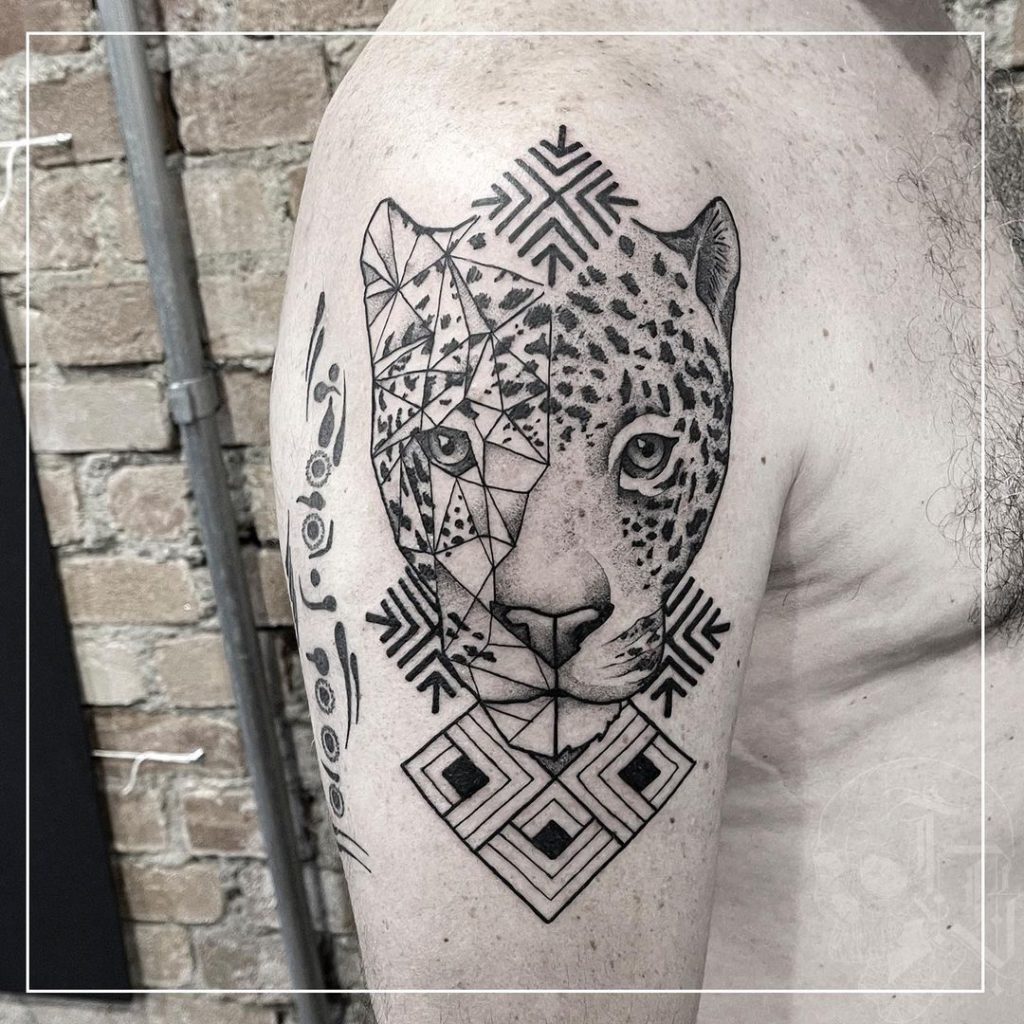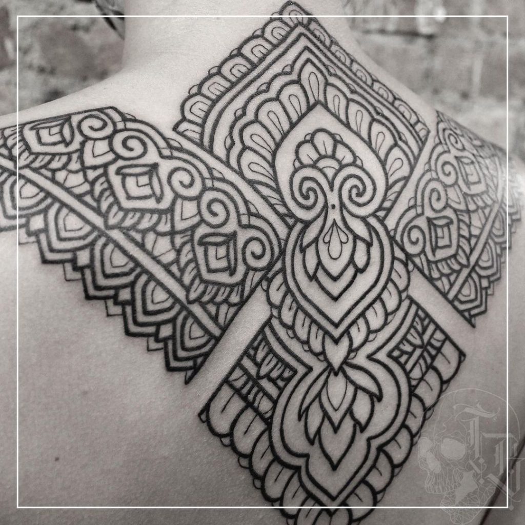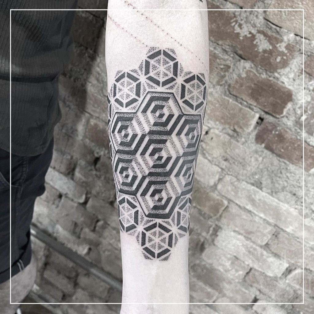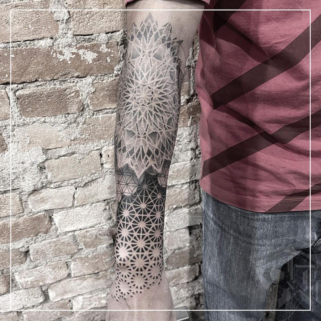 “Na maioria das vezes me pedem animais com formas geométricas, fechamentos com geometrias e trabalhos ornamentais… no fundo, traduzem bem algo que curto fazer que é misturar calma e caos em meus trabalhos.