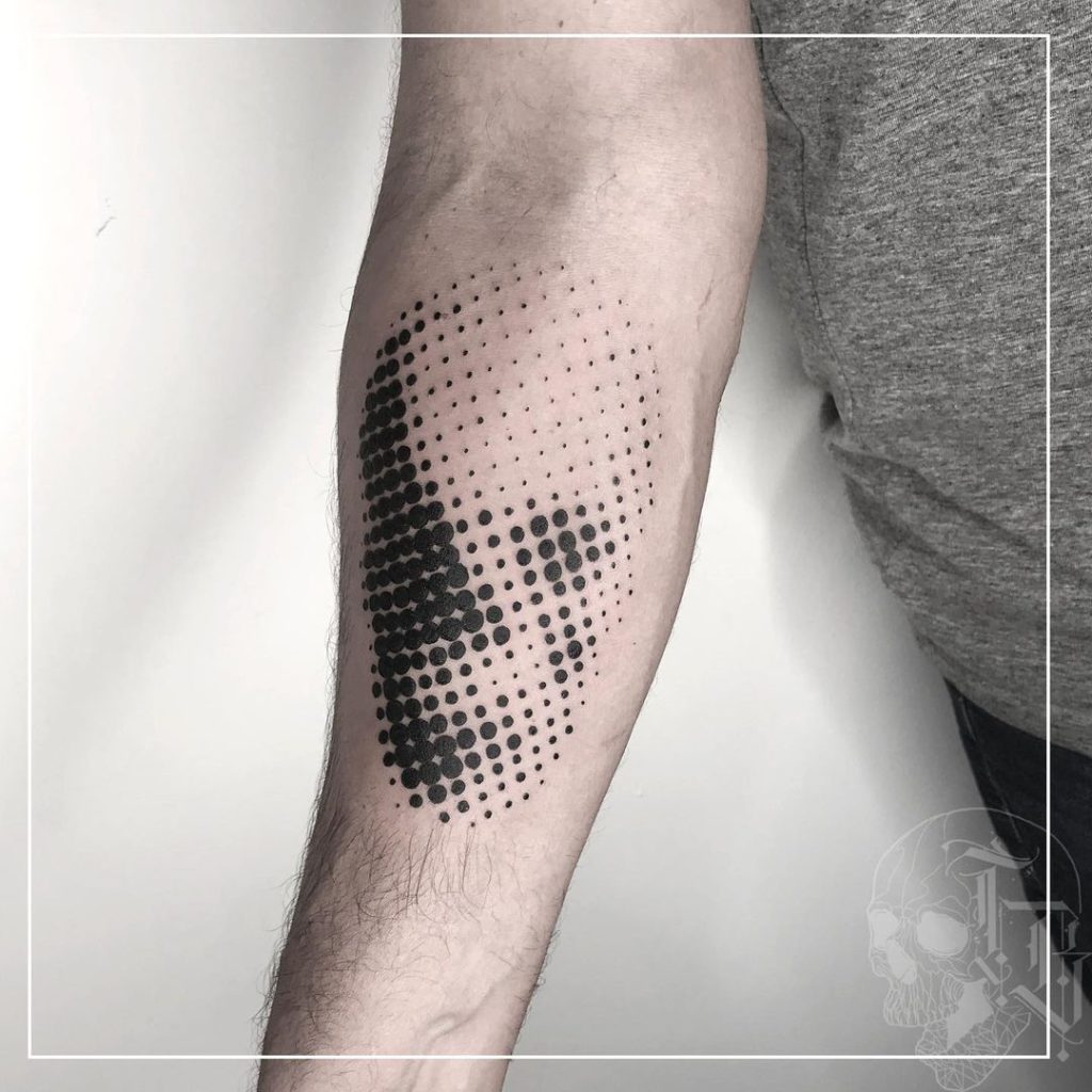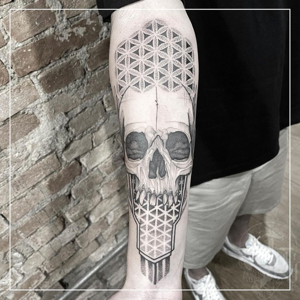 “Eu já tatuei várias histórias inspiradoras e incríveis que fica até difícil pontuar uma… mas uma bem recente foi de um garoto (Santiago) que teve um diagnóstico de leucemia em 2018 e passou 2 anos por um processo doloroso de cura. Ele quis fazer uma caveira, pois nesse tempo ele “passou a entender que por baixo dessa pele e carne, somos todos iguais” e por representar o tempo que ele esteve de frente com a morte e venceu!
