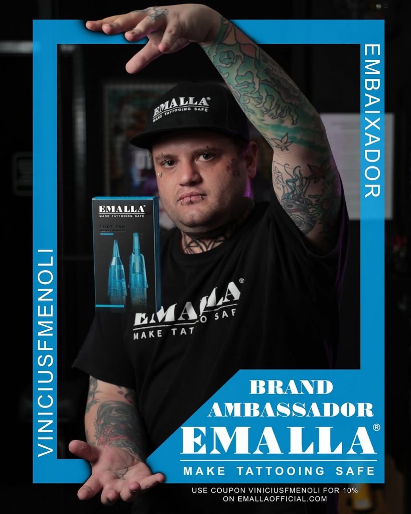 Vinicius Forte: “Foi uma experiência incrível! Quando recebi o convite da Emalla, fiquei extremamente feliz e orgulhoso. Eu já utilizava os produtos da marca e sempre admirei a qualidade deles. Saber que uma empresa desse porte reconheceu meu trabalho e quis me ter como parte do time foi uma validação muito importante para minha trajetória como tatuador.”