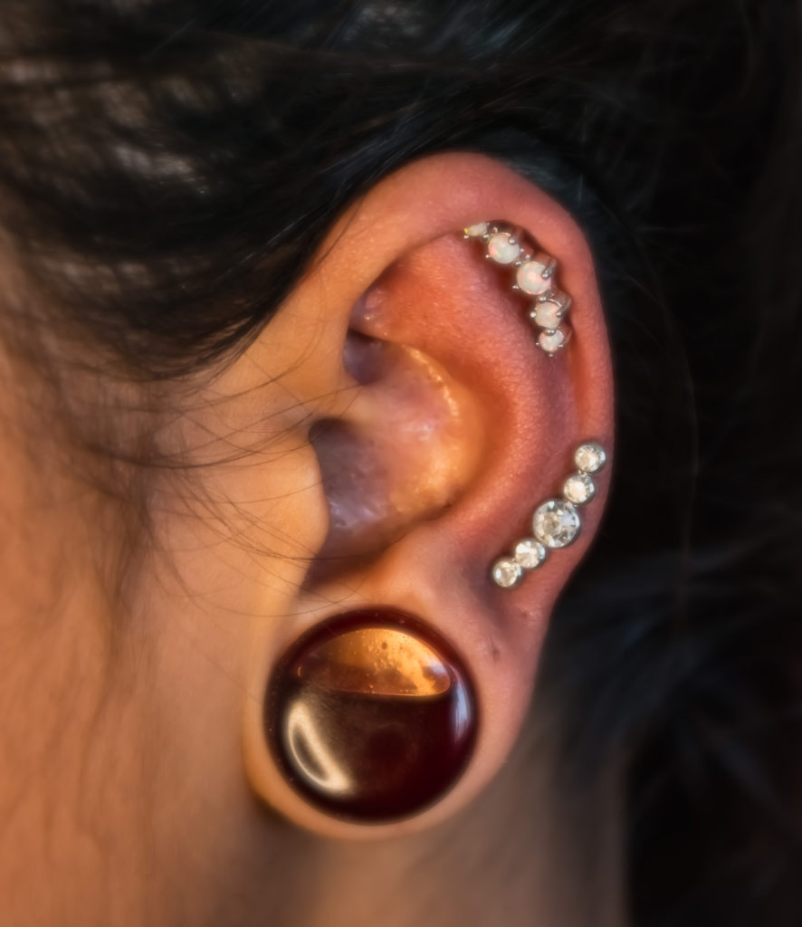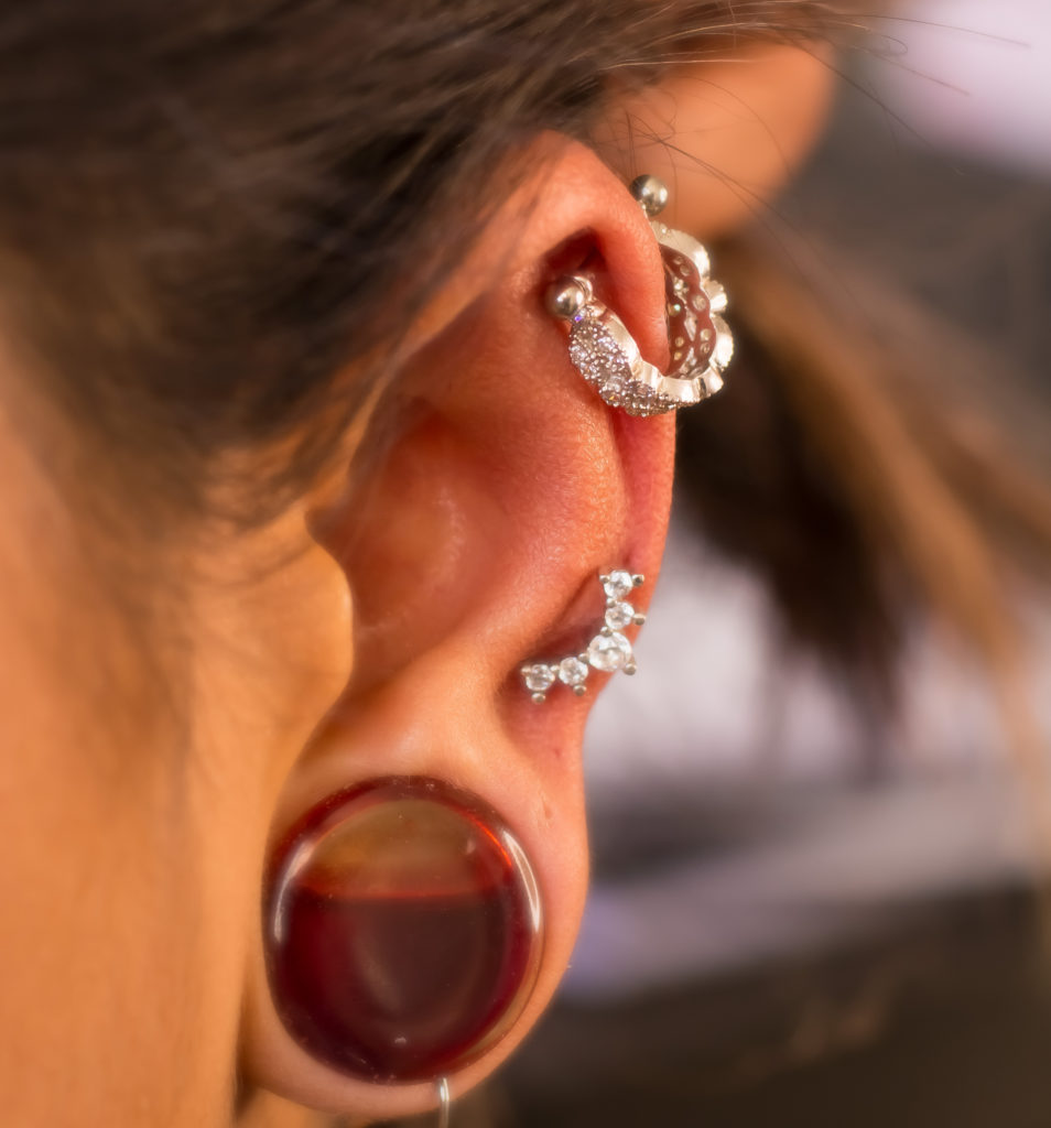 Jóias Cluster 5 – Perfuração feita por e na própria Acácia Piercer. As perfurações são cicatrizadas há mais de 15 anos. Jóias em prata com zircônia – Perfuração feita por e na própria Acácia Piercer. As perfurações são cicatrizadas há mais de 15 anos.
