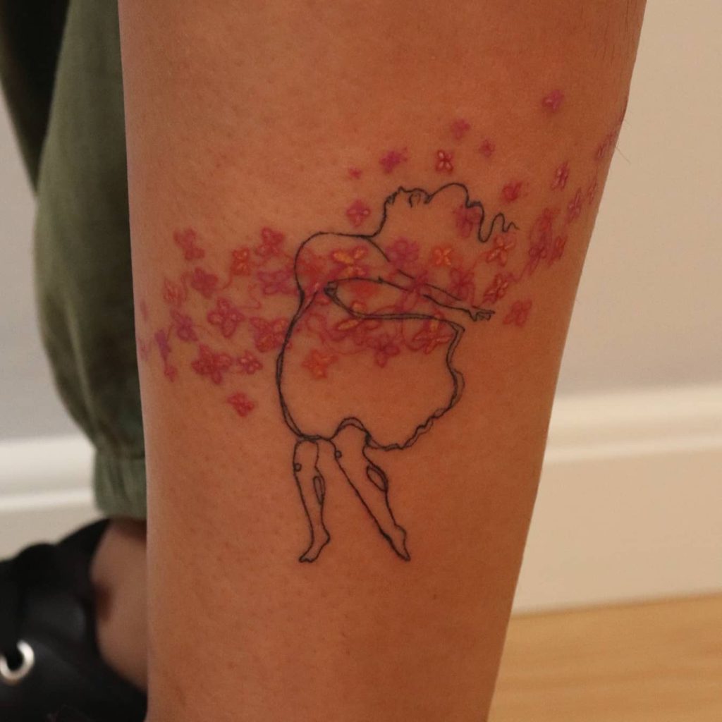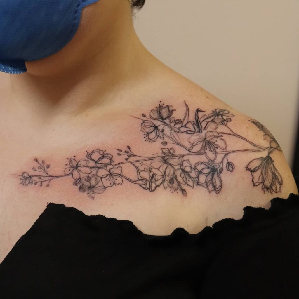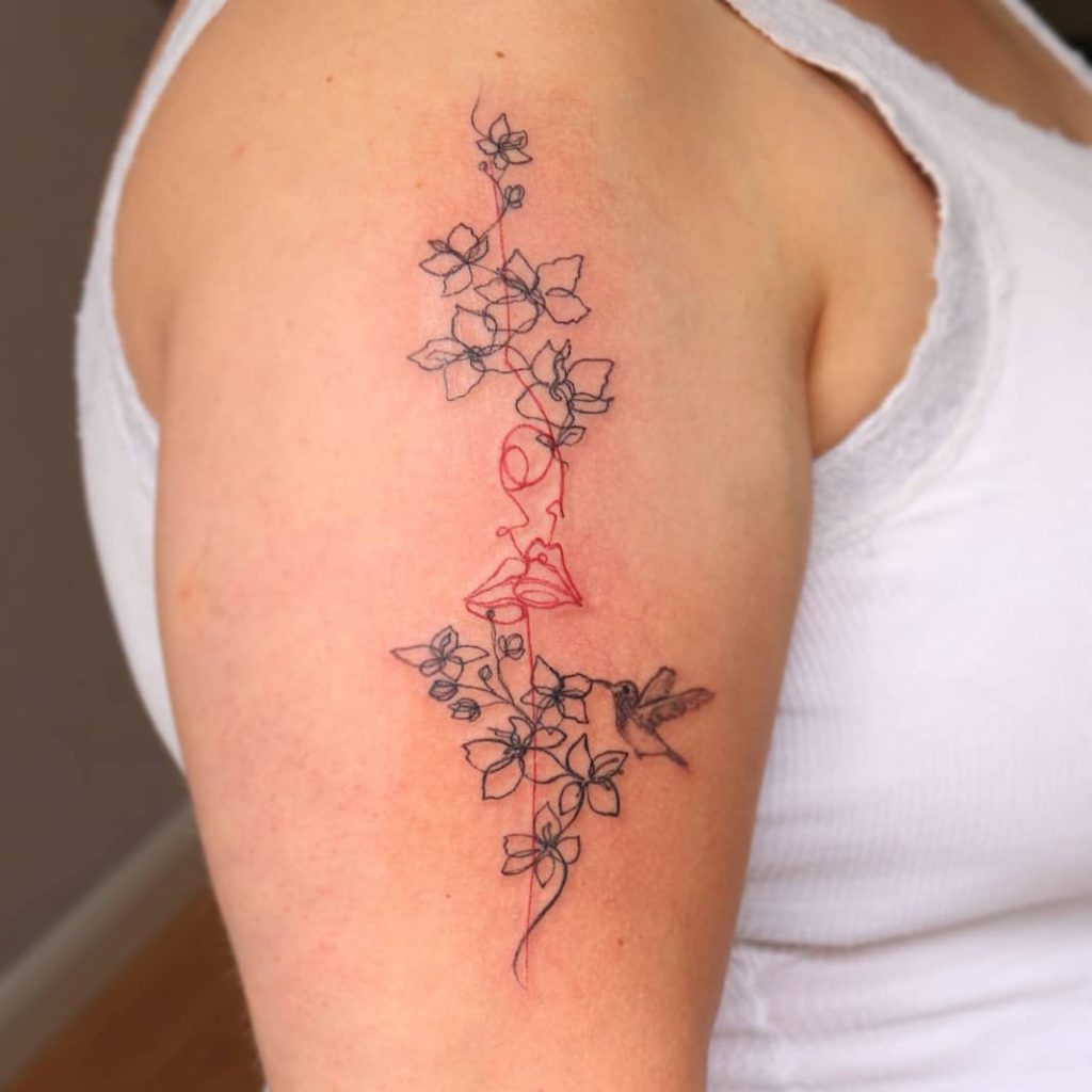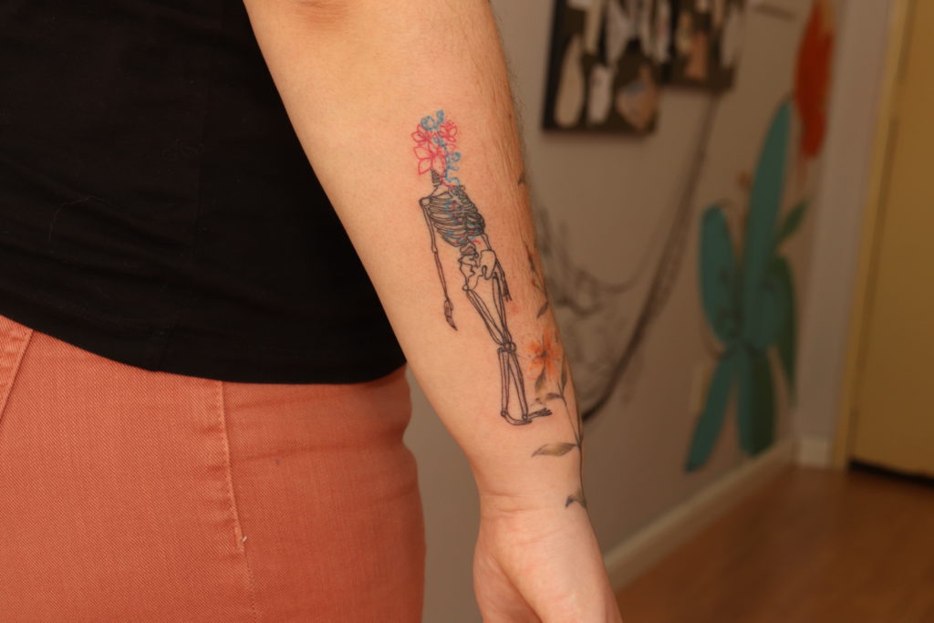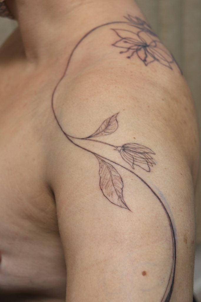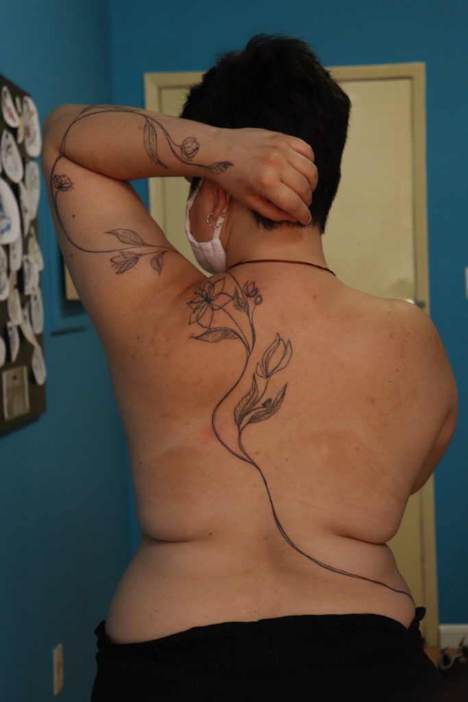 Além disso, também faço tatuagens em freehand (à mão livre) de linhas e elementos botânicos que percorrem o corpo.