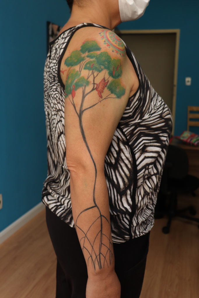 Hoje, tatuando há 3 anos e meio, me sinto realizada e quero aprender cada vez mais sobre o universo da tatuagem. E aquela faculdade de arquitetura… bem, eu ainda estou cursando, vou esticando para ter tempo de tatuar, tenho esperança que um dia me formo.