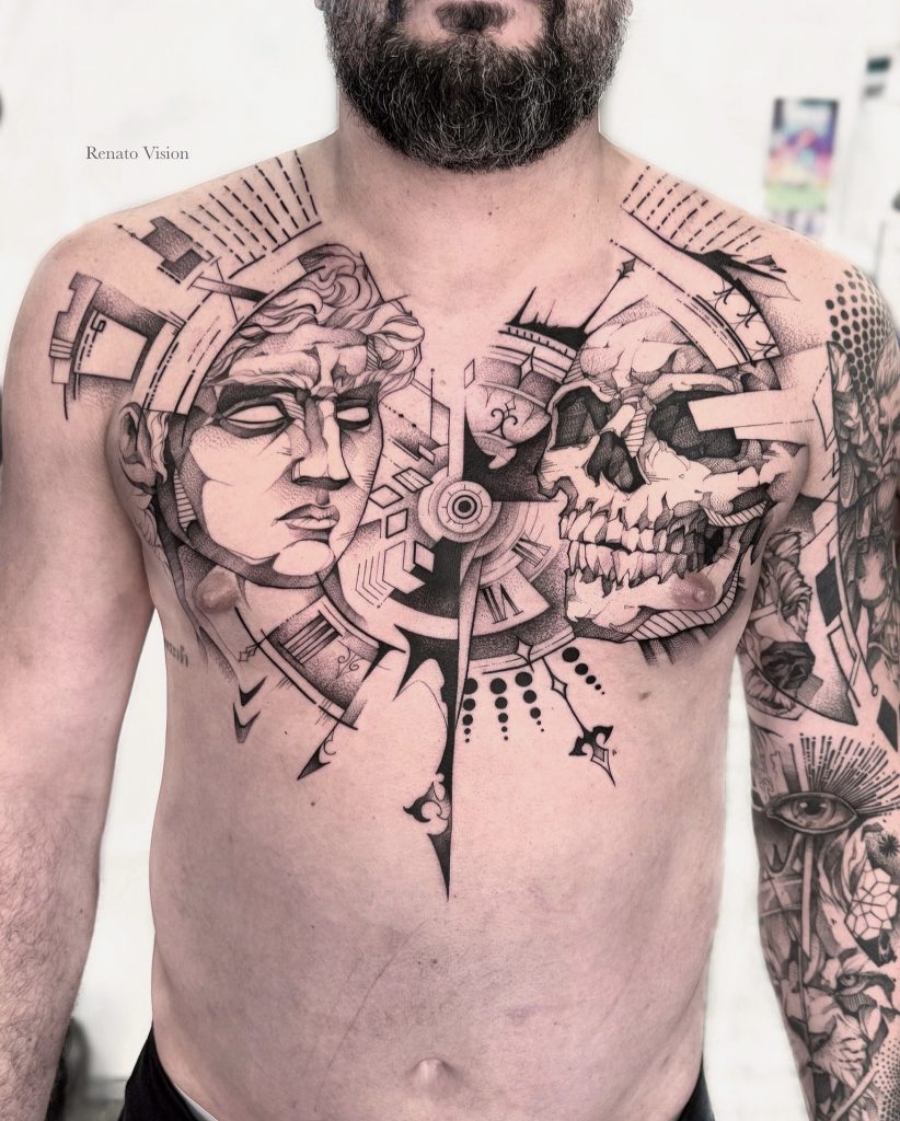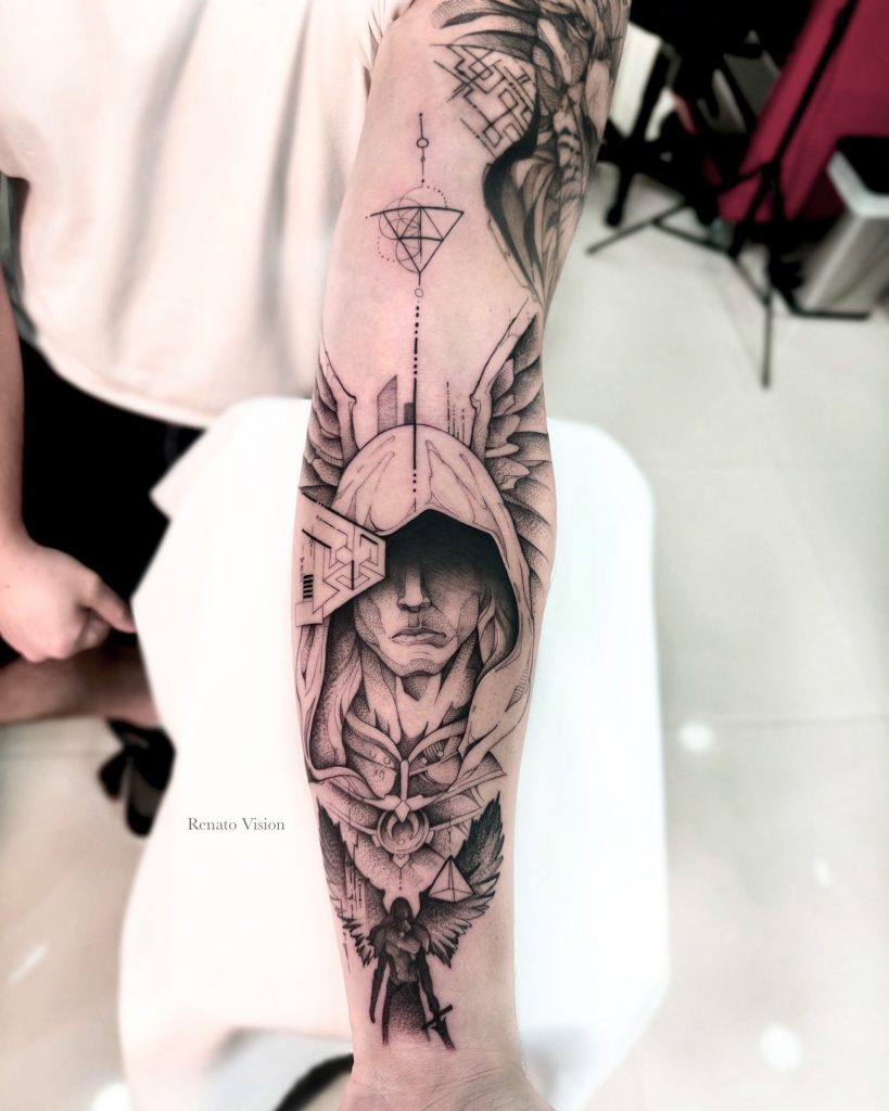 Para Renato, sua arte é uma interseção entre o espiritual e o tecnológico, com uma forte carga emocional e simbólica, que dialoga com o transcendente. Essa combinação única de influências é o que torna suas tatuagens verdadeiramente especiais.